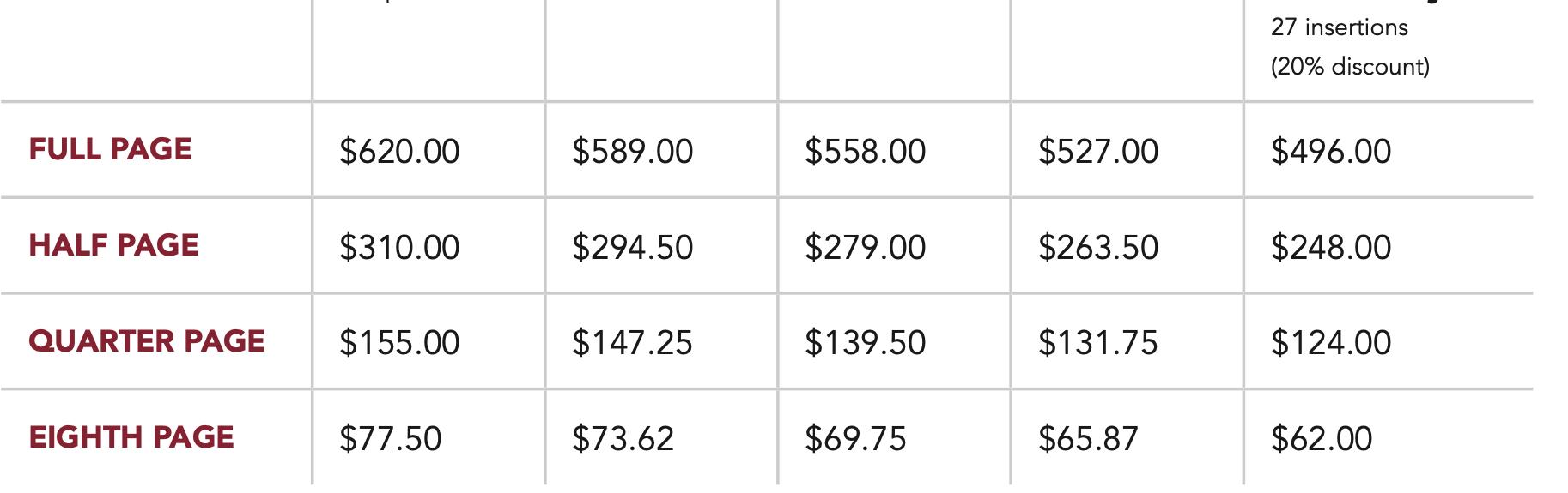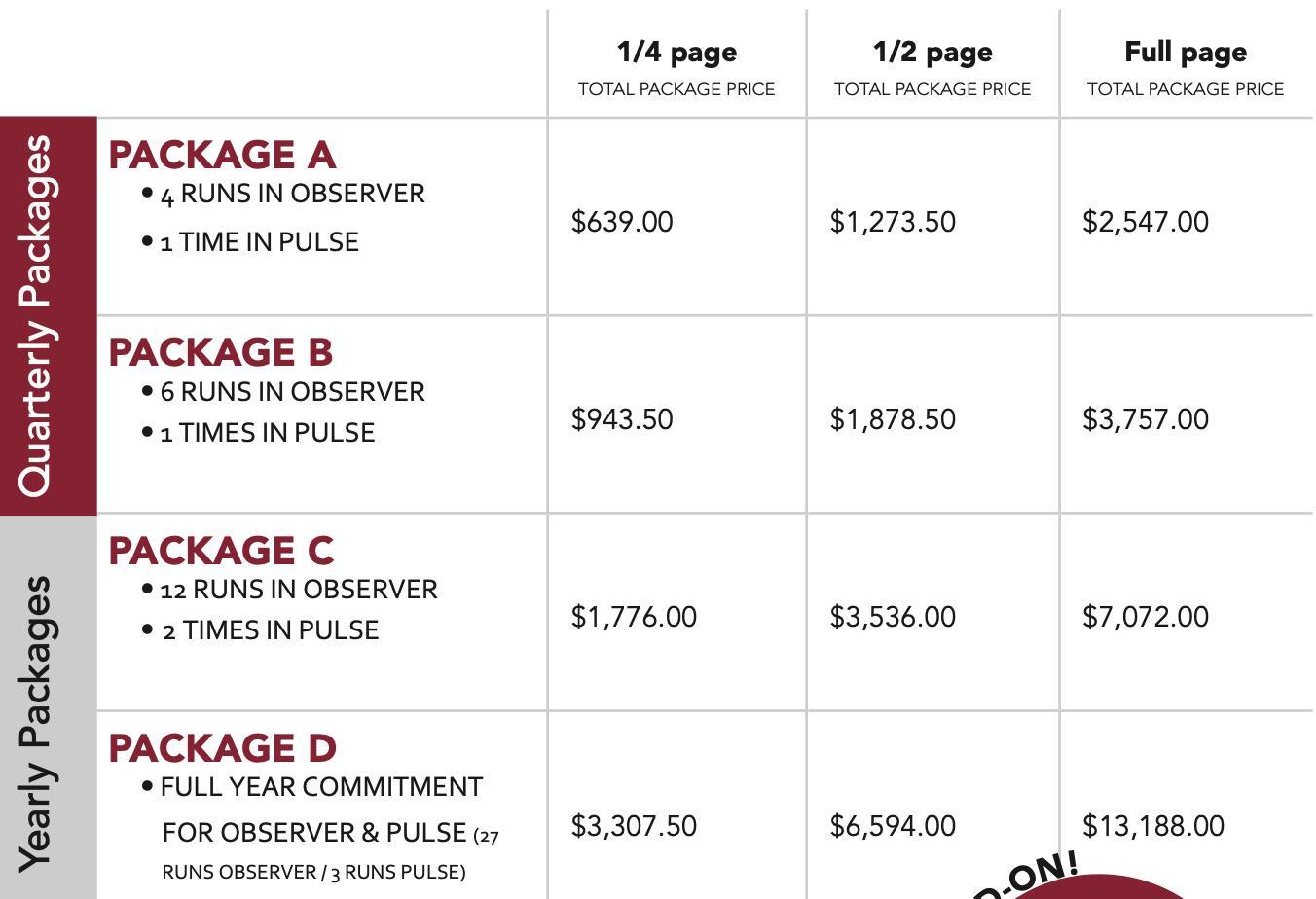 Camera-ready ads are any ad designed and created by the advertiser and sent to the Observer staff, finished and ready to be placed in the paper. A finished ad is a PDF in the correct size, resolution (300 dpi), and color (CMYK), with any supporting documents included, fonts embedded, and images in high resolution. TIFF or EPS files may also be submitted, but are not as effective as PDF files. Files from Microsoft Publisher, PowerPoint or Word cannot be accepted. Ad submitted electronically and not built to the correct size will be re-sized to look as close to the original as possible.