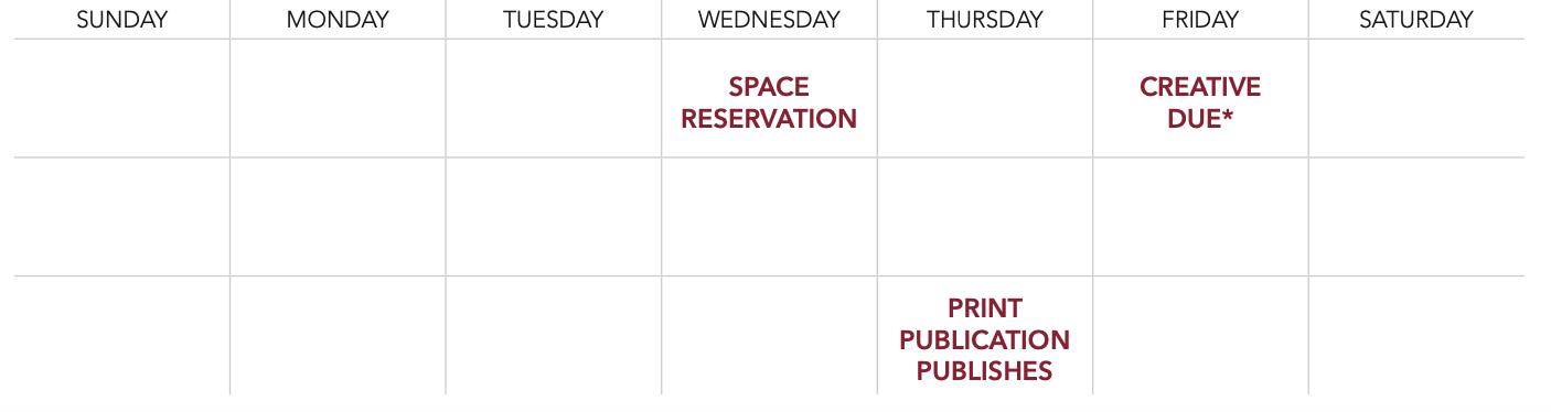 All ads using color must be in CMYK format. All photos and graphic must be converted from RGB to CMYK. All Pantone and spot colors must be converted to CMYK. It is best that all type not in color be designed in black only and not CMYK (also known as process or rich black).