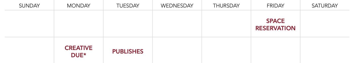 DEADLINES PULSE magazine Friday by Noon Two Weeks Prior to Publishing Date Wednesday by Noon Two Weeks Prior to Publishing Date Ad Space Reservation Camera-Ready Creative Newspaper DEADLINES Monday by Noon Prior to Publishing Date Friday by Noon Prior to Publishing Date Ad Space Reservation Camera-Ready Creative STUDENT MEDIA Department of Communication - College of Arts & Humanities Gretchen Lohse | (509) 963-1066 | Gretchen.Lohse@cwu.edu | 400 E. University Way, MS 7438 | Ellensburg, WA | 98926-7438 7 PRINT PUBLICATION PUBLISHES PRINT PUBLICATION PUBLISHES