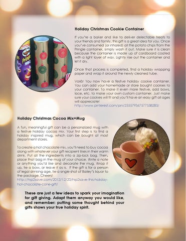 Holiday Christmas Cocoa Mix+Mug A fun, meaningful gift can be a personalized mug with a festive holiday cocoa mix. Your first step is to find a holiday inspired mug, which can be bought at most department stores. To create a hot chocolate mix, you’ll need to buy cocoa along with whatever your gift recipient likes in their warm drink. Put all the ingredients into a zip-lock bag. Then, place that bag in the mug of your choice. Write a note or anything you’d like and decorate the mug. Wrap it up, tie a bow, or leave it as is. If the gift is for a person of legal drinking age, tie a single shot of Bailey’s liquor to the package. Cheers! http://hip2save.com/2012/12/20/hip2save-this-holidayhot-chocolate-cone-gift/