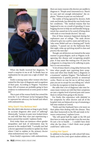 there are many reasons why doctors are unable to diagnose it. “People aren’t interested in it. There’s no cure and not enough information,” she explains. “Women in pain are not believed.” The reality of being ignored by doctors, both male and female, has altered the way Emily treats her conditions. “The medical trauma that has happened to me, as a result of spending 12 years begging doctors to help me and literally being ignored, has caused me to be scared of being alone with male or even female doctors,” she says. One of these instances happened during her sophomore year of college. “The male doctor refused to give me a pelvic exam and told me to, ‘take some Midol and use a heating pad’,” Emily explains. “I passed out on the bathroom floor that night, woke up and drug myself to class and practice the next day.” Though, not all doctors are trained in the same manner as gynecologists, such as Wagner, in diagnosing this disease and recognizing people’s pain. It may seem like waiting over 10 years for a diagnosis is a long time to be suffering in pain, but it is not uncommon. “A lot of times there’s a long delay between the time when people start reporting their symptoms and when they finally have a diagnosis or a treatment,” explains Wagner. “The hallmark of endometriosis is painful periods or menstrual cycles. There’s no way for me to tell how much pain you are in except for you telling me,” which is what she recognizes to help her patients. She adds that a lot of diagnoses take time because many women are told that their symptoms are just a regular level of period pain and causes them to refrain from going to the doctor. For Emily, this experience with disbelief in her symptoms by other doctors and all of the hospital visits are balanced on top of remaining a full-time student at Central. “Emily and [her husband] have a lot more on their plates than dealing with this disease. They take their homework to the ER and study in between contractions,” explains Lewis. “She will spend half the night in the ER and then have to wake up and take a test the next day. It’s just a lot to handle … I couldn’t have done what she has done. I don’t think most people could have,” adds Lewis. Losing Her Sport In addition to keeping up with school full-time, Emily used to be a two-sport student-athlete, on