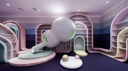 Includes a large play center, a party place, a library and areas for kid-friendly activities. All areas have a distinct story-world quality, decorated with digital projections on wall where diners can have an immersive experience in a fairyland.
