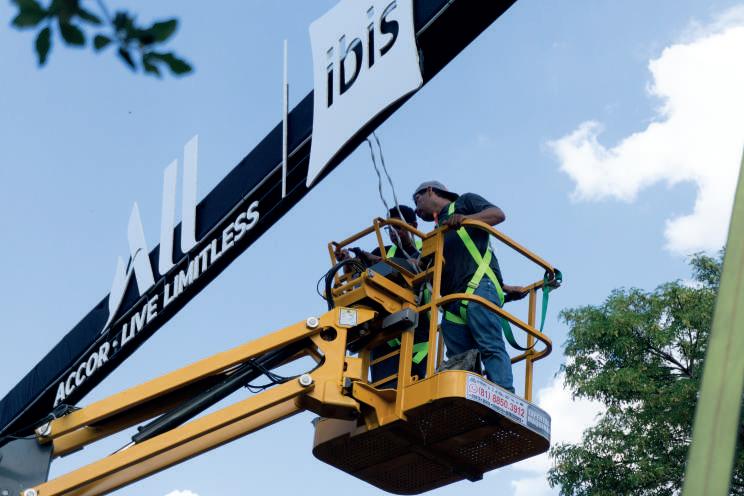 El stand de Ibis tiene un área de 10 x 10 metros en piso y un frente compuesto por un marco de truss que llega a los 7 metros, coronado por un letrero luminoso con el logo de la marca.