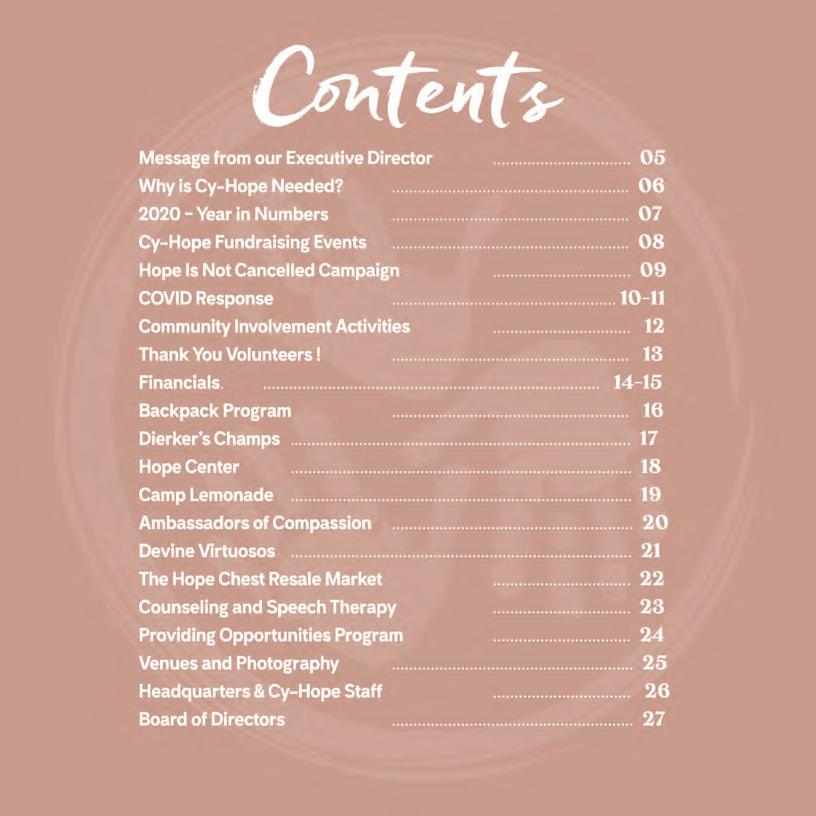 2020wascertainlyayearfullofadversity,butbecauseofourdedicateddonors,volunteers, staff,andboardmembers,Cy-Hopewasfortunatetobeabletoshinethelightofhopeand makeadifferenceinourcommunity.