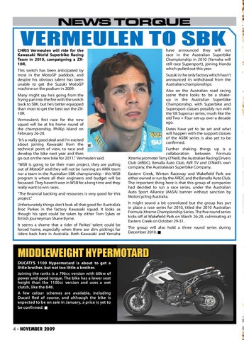 Middleweight Hypermotard DUCATI’S 1100 Hypermotard is about to get a little brother, but not too little a brother. Joining the ranks is a 796cc version with 60kw of power and good torque. The bike has a lower seat height than the 1100cc version and uses a wet clutch, like the 848. A few colour schemes are available, including Ducati Red of course, and although the bike is expected to be on sale in January, a price is yet to be confirmed. n