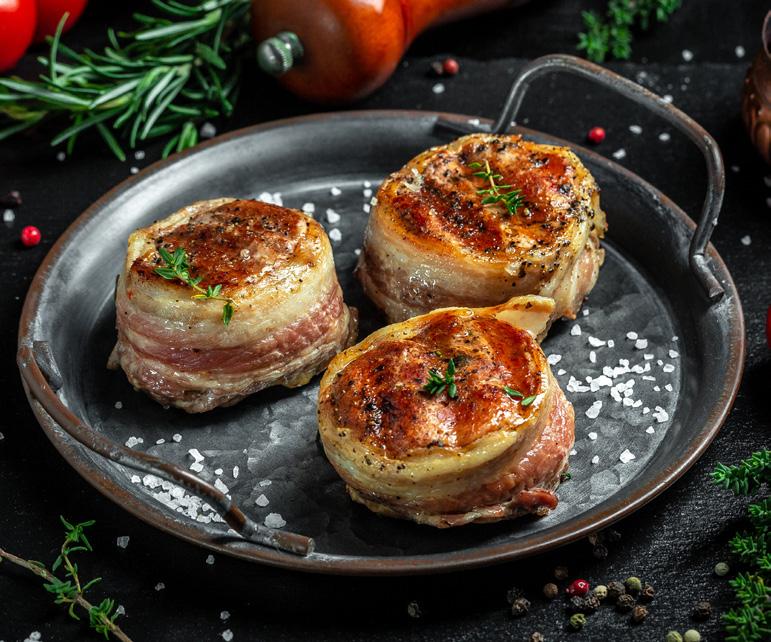 roast beef fillet wrapped in bacon, served with broccolini and reduced meat juices (GF)(DF)