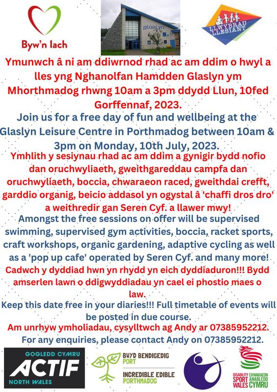 Llwybrau Llesiant have organized a Wellbeing Day (see poster attached) at Glaslyn Leisure Center in Porthmadog on Monday, July the 10th.