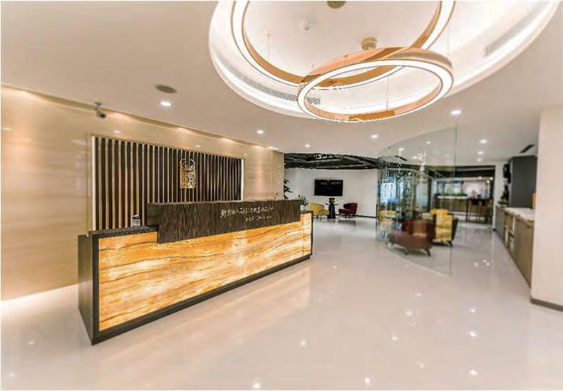 石材堅實如鑄鐵 極見精神與生 命力 藝術砂岩燈箱彼此交疊卻 又主次分明 吊燈環扣如落筆之 處 起落之間繫起藝廊 藏書 休息空間