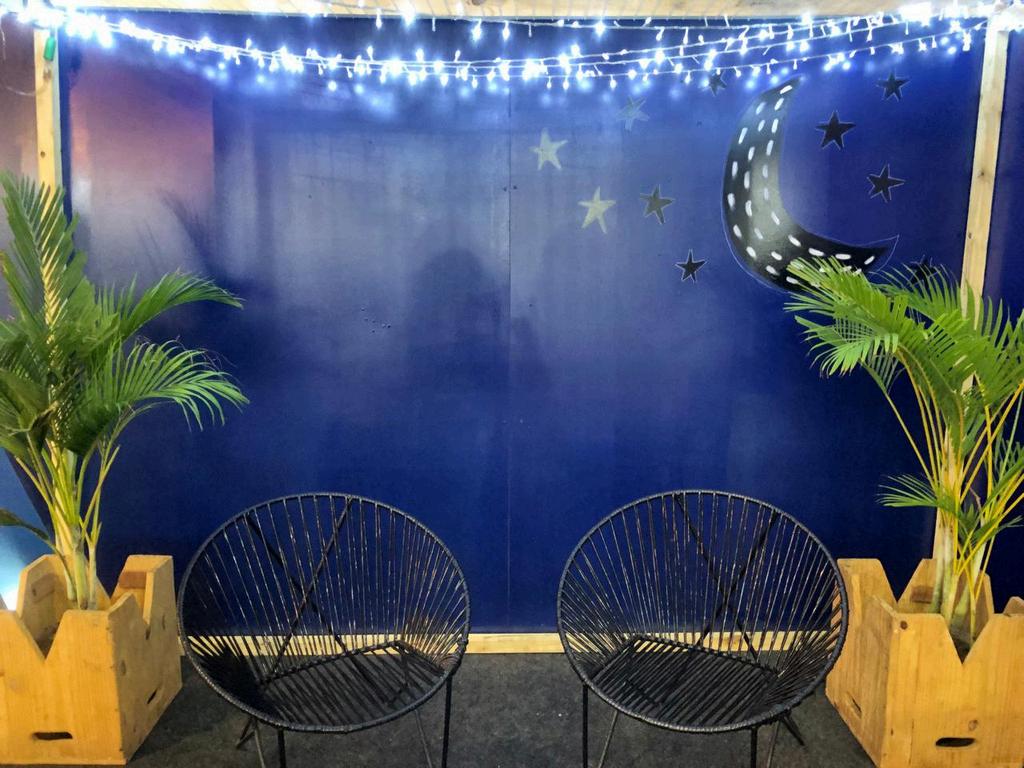 Mais Cinquenta anos se passaram desde a criação do Movimento Armorial, com a missão de valorizar os elementos culturais populares do Nordeste Brasileiro De lá pra cá, temos a certeza de que essa missão foi cumprida na multiplicidade da arte, e celebramos a singularidade desse movimento artístico com a Praça de Descanso: Dizidos das horas no Sertão, em homenagem a música de Jesser Quirino A concepção do espaço parte do pontear do relógio do sertanejo antigo, dividindo o dia em três momentos, que correspondem aos três ambientes da praça, e dos quais extraímos a cartela de cor e luz, e desenha o painel de fundo com figuras da xilogravura, tão celebradas no movimento armorial O primeiro ambiente, A manhã braça de sol, com a cor a amarela; em seguida A tarde da hora branda sem calor, recebe o azul claro que logo se despedirá do sol Esses dois ambientes que representam o dia tem iluminação de cor quente no painel Já o terceiro ambiente é A noite ou o fim do versejar, o azul escuro toma o painel E o céu estrelado do sertão então é construído com teto de fio de luz pisca-pisca fazendo as estrelas e de fios de barbante em textura natural, que remetem a forma com que literatura armorial era vendida O ambiente conta ainda nuvens luminárias suspensas que lembram o quanto a chuva é bem-vinda no dia de São José Junto ao painel, um tablado de cor terrosa representando a terra, une essas horas sertanejas A escolha dos móveis de pinos remetem aos móveis das bancas de feiras que acontecem aos sábados e reúnem as pessoas na cidade. Cactos construídos em canos PVC recebem as tomadas para carregar dispositivos móveis, e representam a vegetação da Caatinga O layout distinto na área de assento, com tais mobiliários, se alinha a dualidade do dia e da noite A praça é uma celebração do universo popular do Nordeste Brasileiro, e proporciona em cada um dos seus ambientes um momento para tirar um retrato e lembrar da experiência de estar na 21° Feneart
