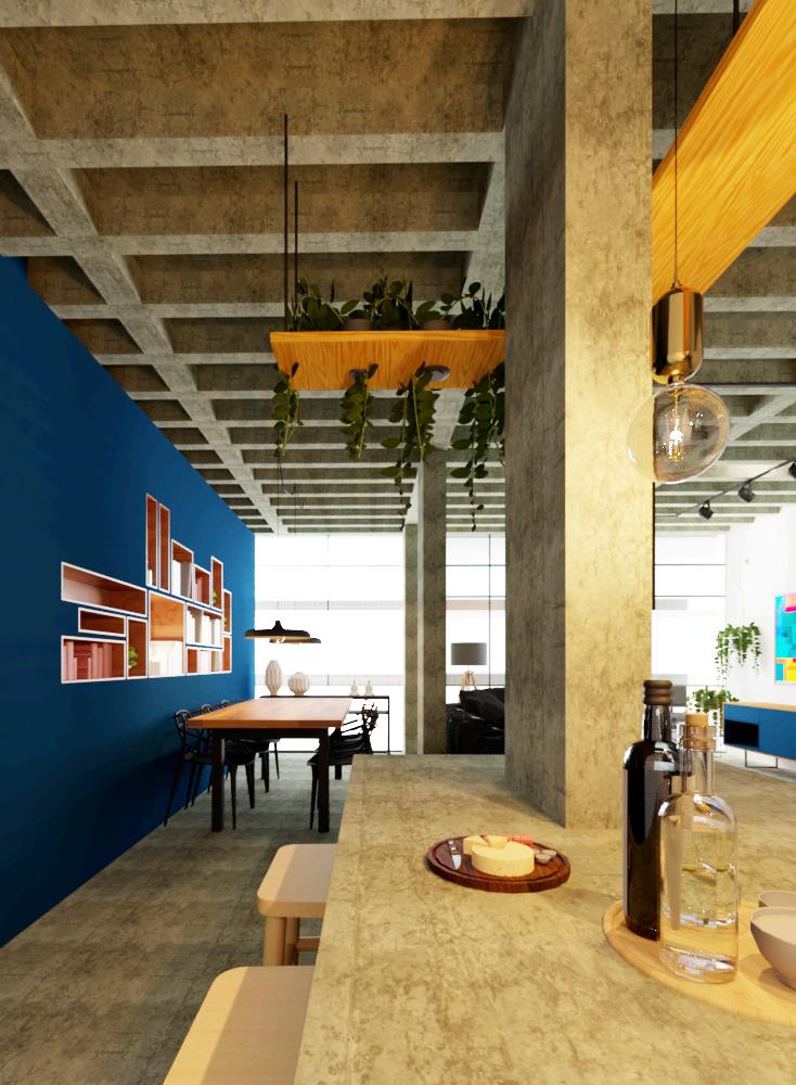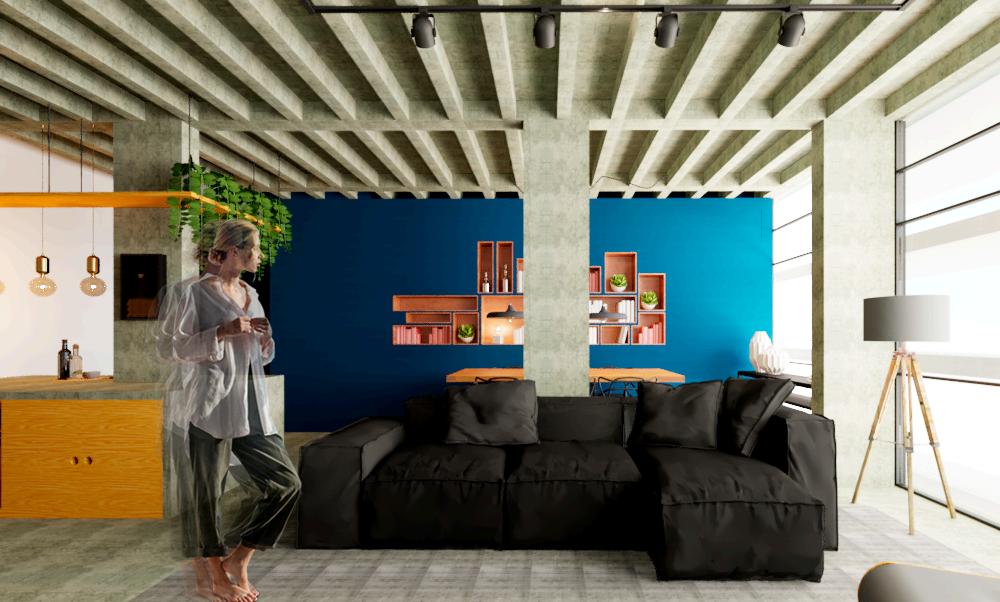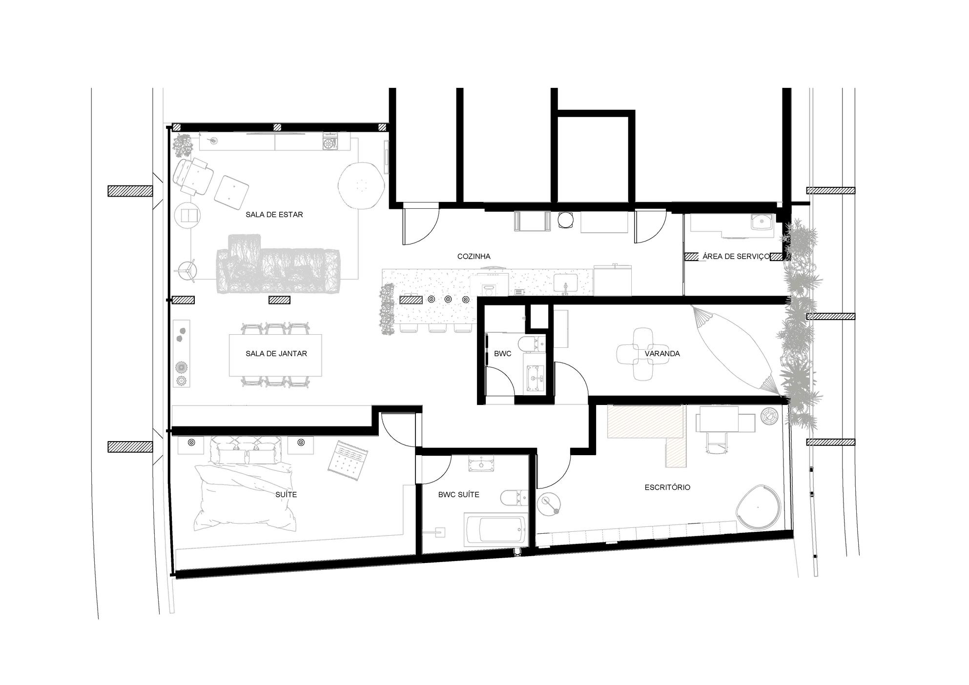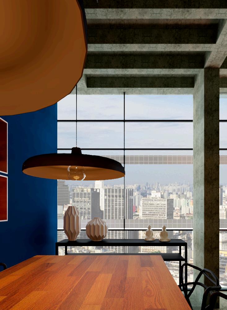 neste projeto para um apartamento no edifício Copan, em São Paulo, a verdade dos materiais foi o mote para a decisão dos móveis e paleta de cores. utilizando o concreto aparente, metais pretos e bastante madeira, a atmosfera desejada tinha a ideia mais aconchegante para atender o desejo de uma moradora jovem e bastante cosmopolitana foi feito a integração da sala de estar com a de jantar e cozinha, com um conceito aberto e bastante contemporâneo além desses ambientes, foi estudado também o layout da suíte e do escritório, de acordo com a necessidade e perfil da cliente.