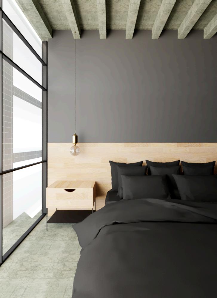 para o quarto a feminilidade minimalista fica por conta do uso de poucas cores e da madeira enquanto elemento acolhedor contrastando com a cor preta e os acabamentos em concreto de piso e teto.