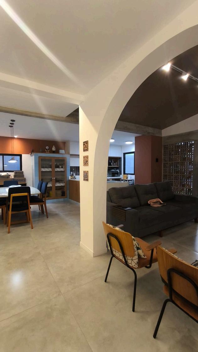 A integração da cozinha com as salas de estar e jantar se deu com a retirada de paredes e um arco marca a passagem da área de brincar do filho do casal e dos gatinhos pra área de estar da família.