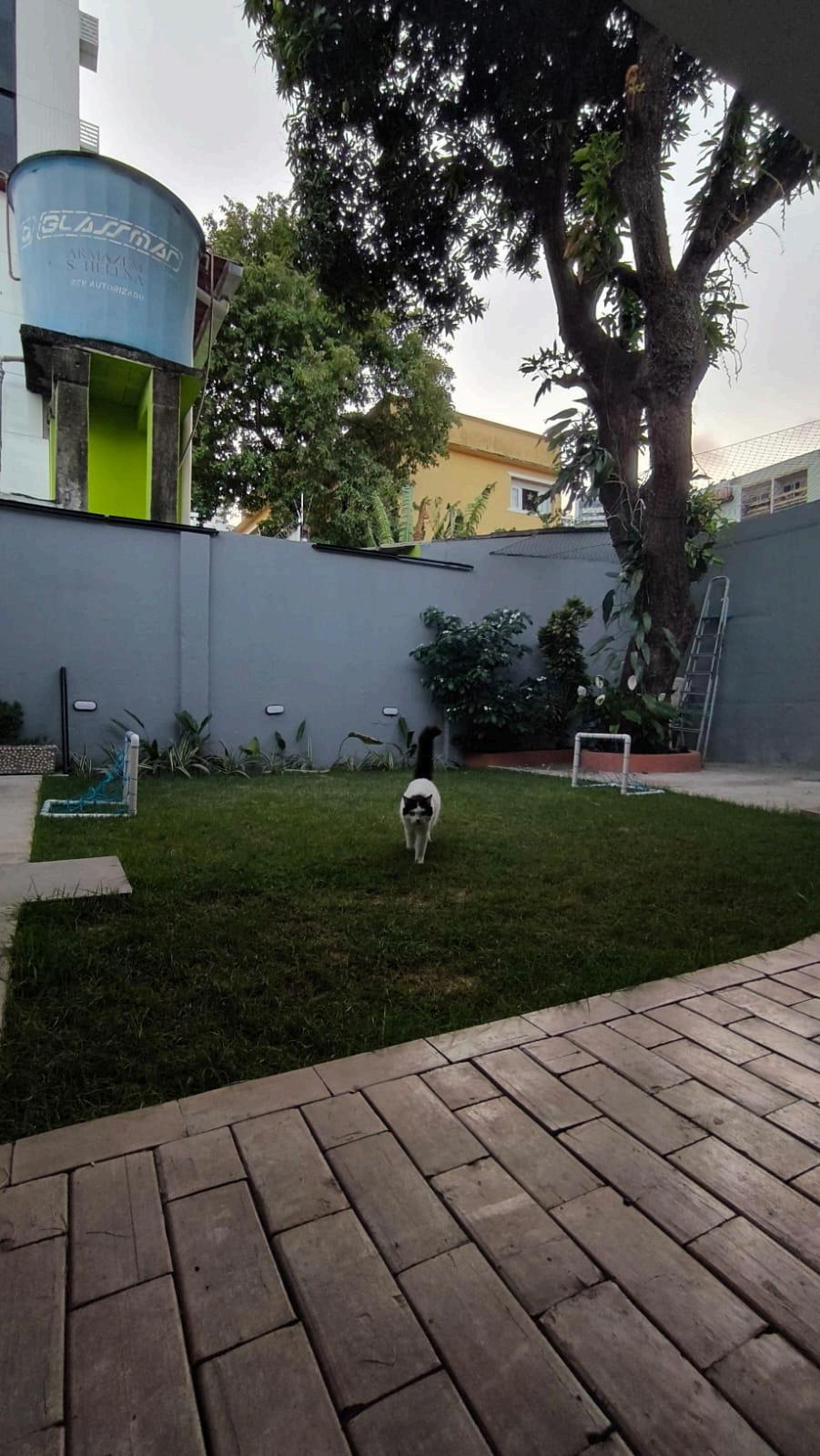 As grades foram substituídas por cobogós, transformanddo a antiga garagem em Hall de Entrada com chapelaria e brinquedoteca para o filho o casal e os gatos da família Manteno a iluminação e a ventilação do cômodo