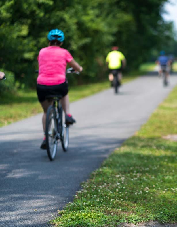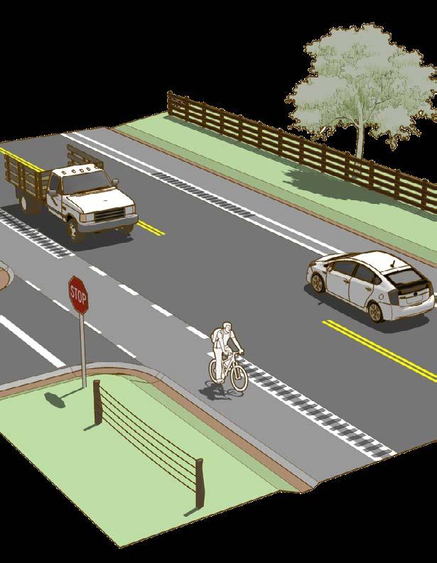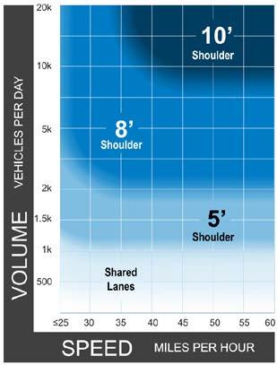 • Wide Shoulders (at least 8') to comfortably accommodate people biking, or separated bike lanes in areas with high biking demand.