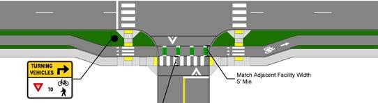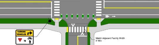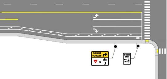 • Where there are high volumes of right turning vehicles (greater than 150 vehicles per hour for a oneway separated bikeway or 100 vehicles per hour for a two-way separated bikeway or sidepath)