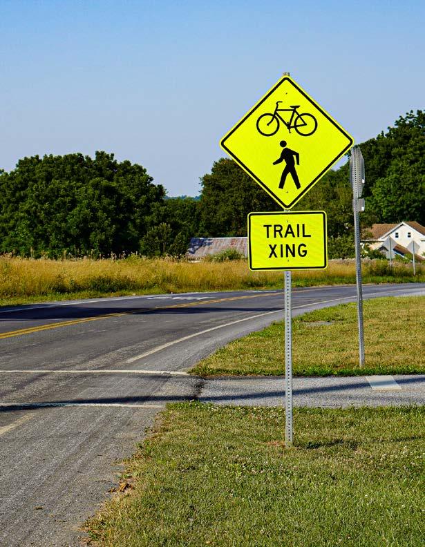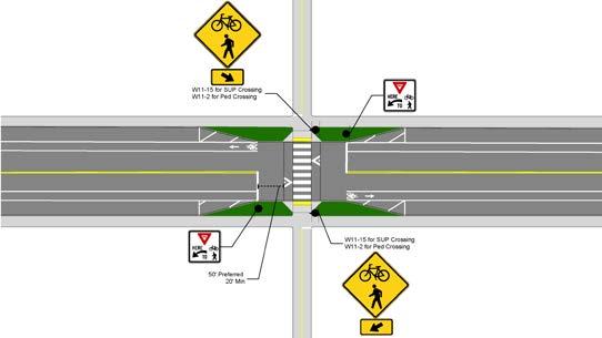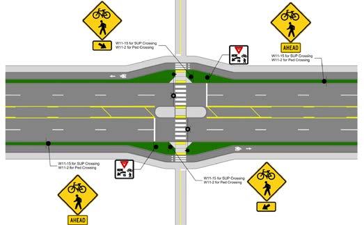 “Trail X-Ing” (MUTCD W11-15 and W11-15P) may be used to alert drivers to a shared use path crossing, especially when the path crossing is located midblock.