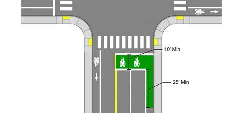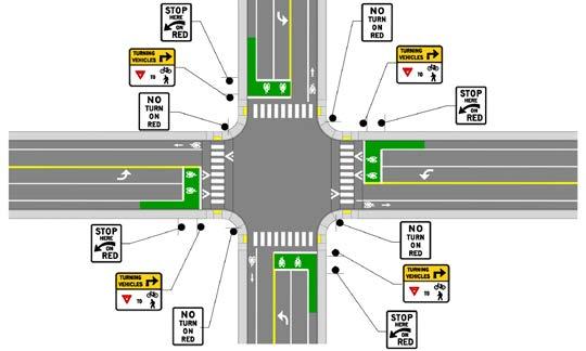 People biking are provided a 3to 5- second head start in front of all vehicles. This treatment may also provide a head start for people walking.