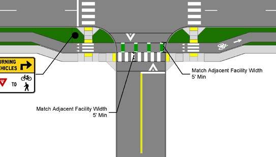 At intersections and driveways, conflict striping should be considered to improve visibility for all users.