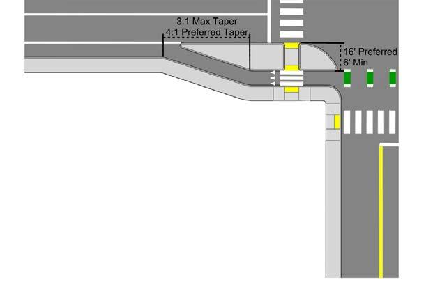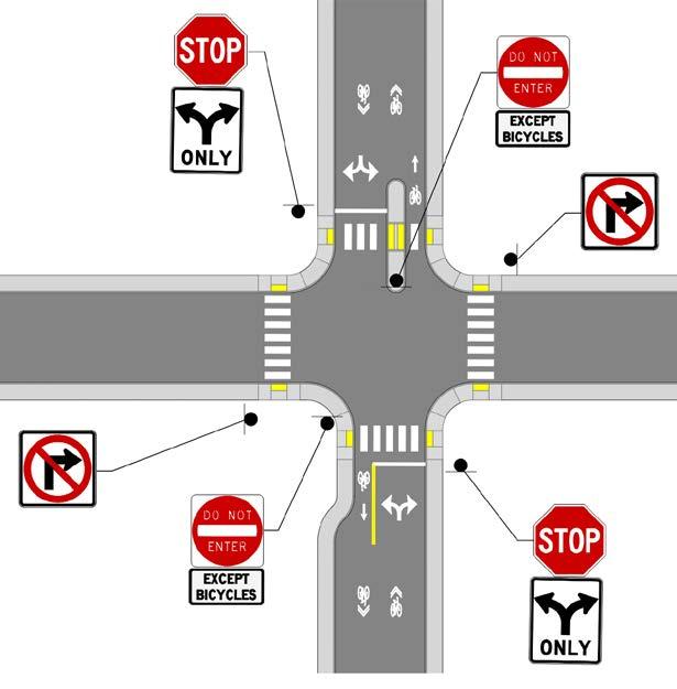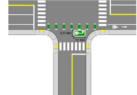 • At intersections with unique bicycle movements, such as a diagonal transition or to provide for a bike through movement across a T intersection where no concurrent vehicle movement exists