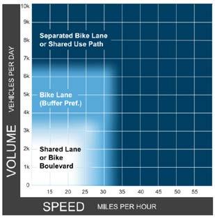 Designing for people of all ages and abilities requires physical separation at certain vehicle volumes (y-axis) and speeds (x-axis). The FHWA Bikeway Selection Guide provides general guidance for providing the appropriate facility based on the volume and speed of a road.