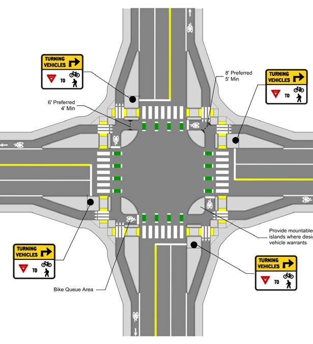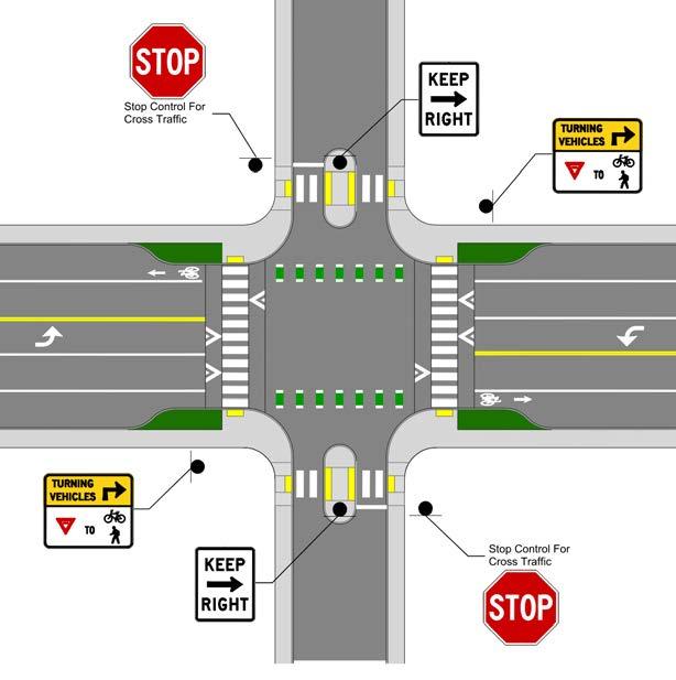 At intersections, every effort should be made to maintain separation between people biking, walking, and driving. Potential intersection treatments which should regularly be considered include protected intersections, protected roundabouts, dedicated intersections, and two-stage left-turn queue boxes, among others.