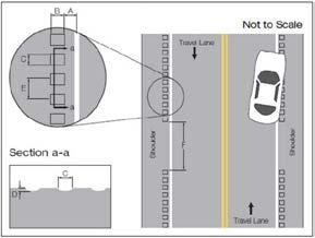 • Spacing (E): The distance between adjacent rumble strips. It is most often measured from the center of the strip to the center of the adjacent strip.