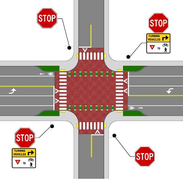 Through moving vehicles start at the same time as people biking and walking. A flashing yellow turn phase is then provided for right turning vehicles.