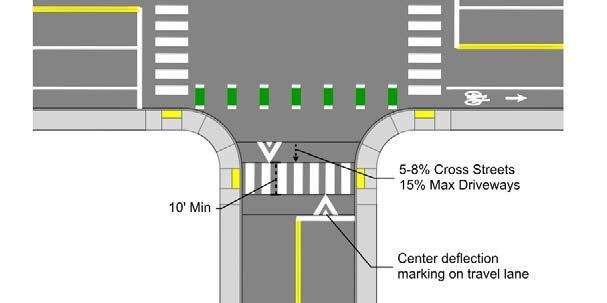 When crossing side streets and higher volume driveways, raised side street crossings, slow turn wedges, and tight turn radii may be considered in addition to conflict markings to highlight the path crossing.