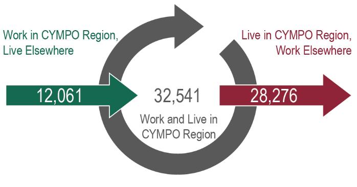 Understanding how residents, employees, and visitors travel in the CYMPO region helps to determine the transportation needs of the region. Commuting flows and where residents and workers travel are summarized below.