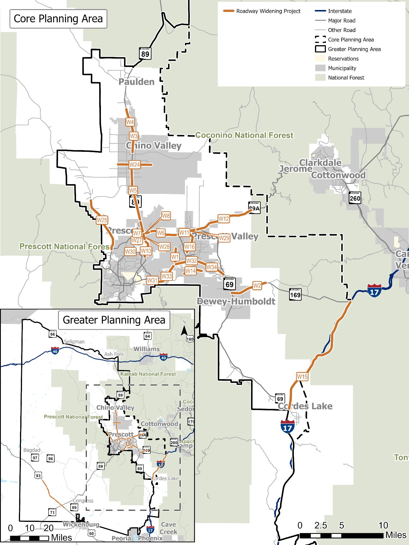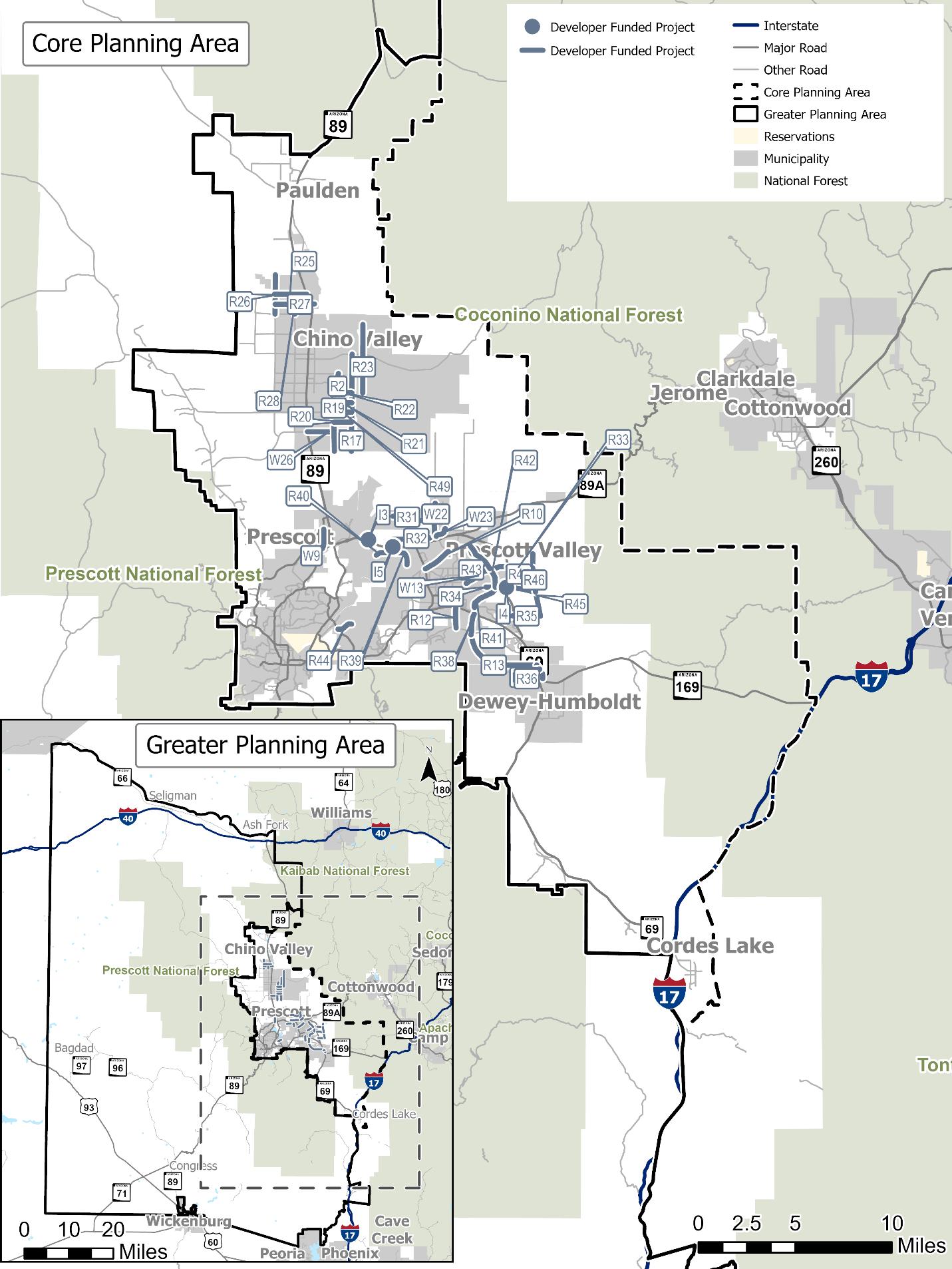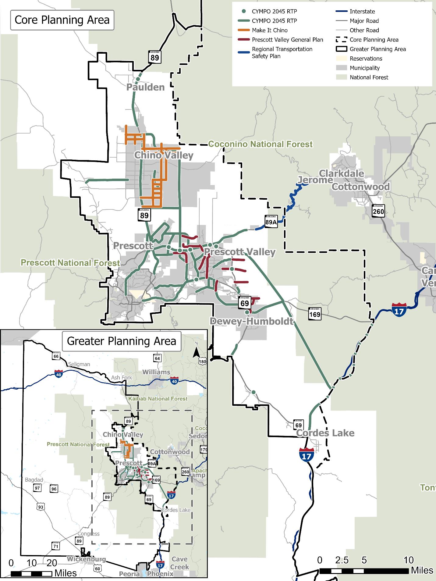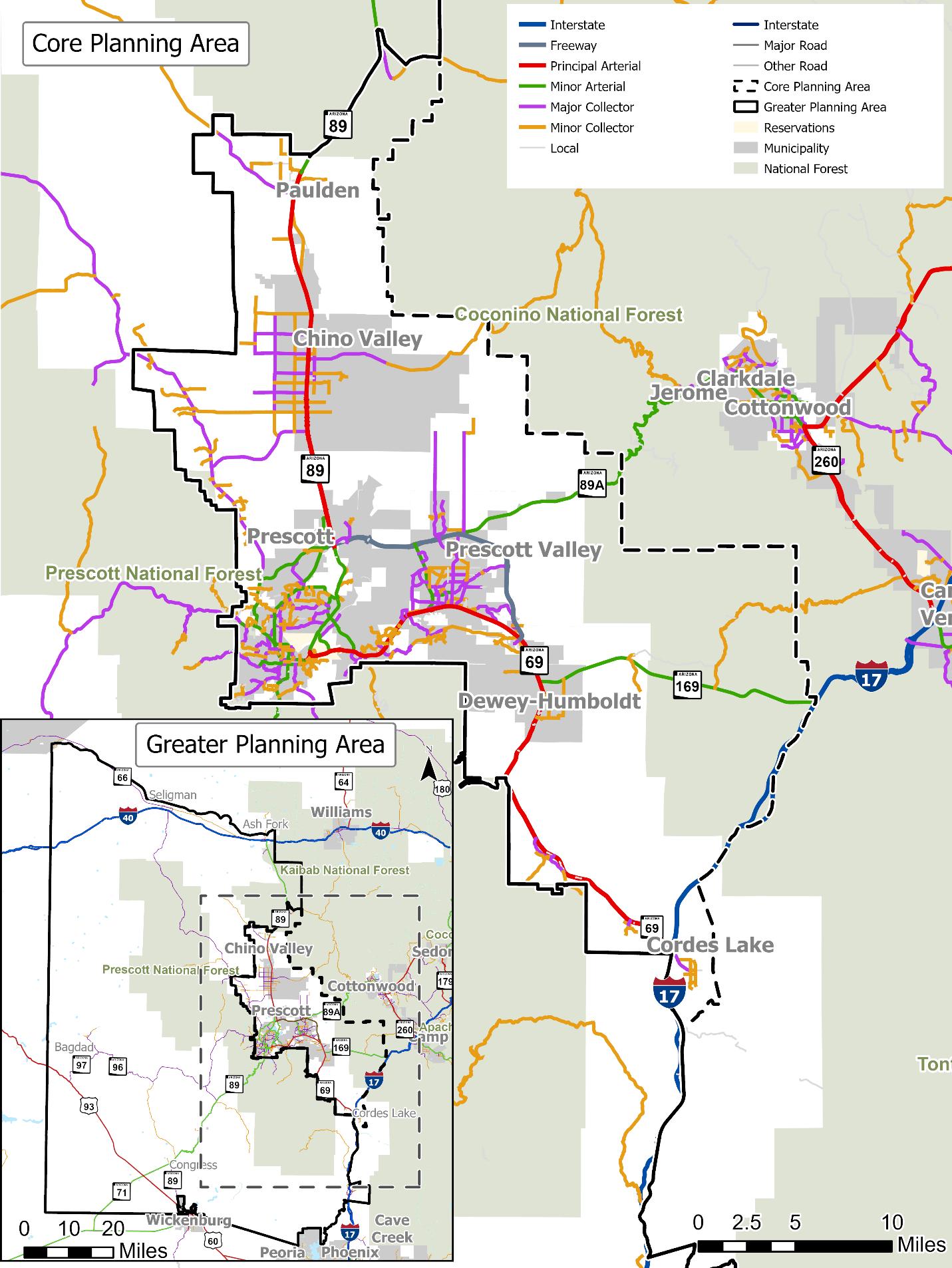 • Greater Planning Area. This area includes much of the newly added areas to the MPO boundary that encompass western and southern Yavapai County