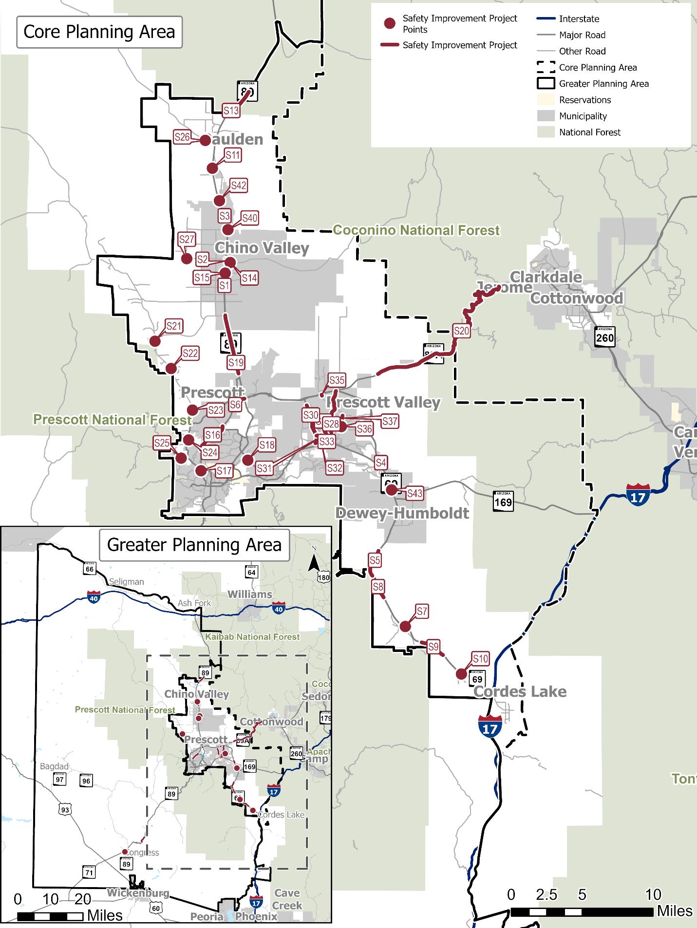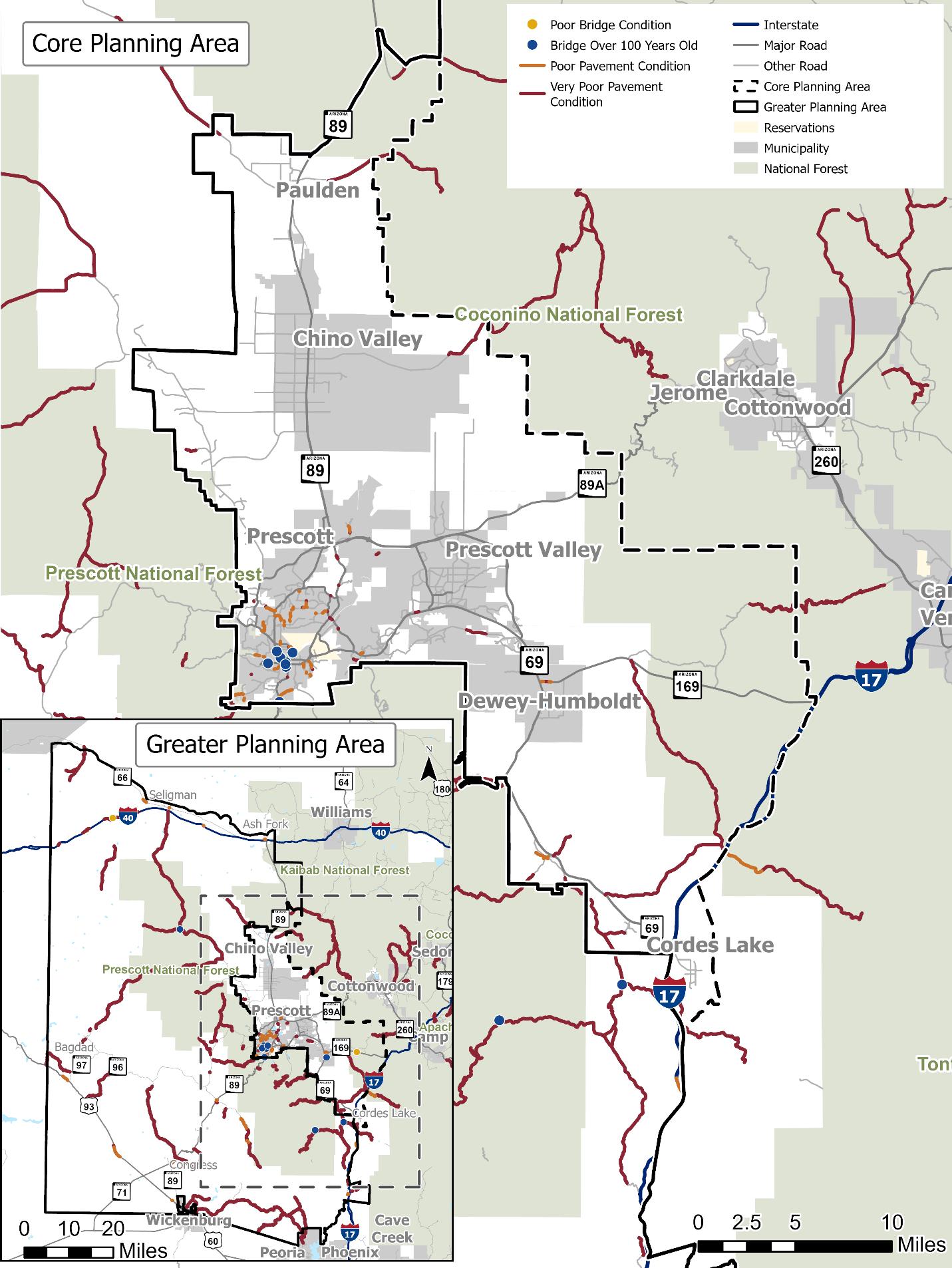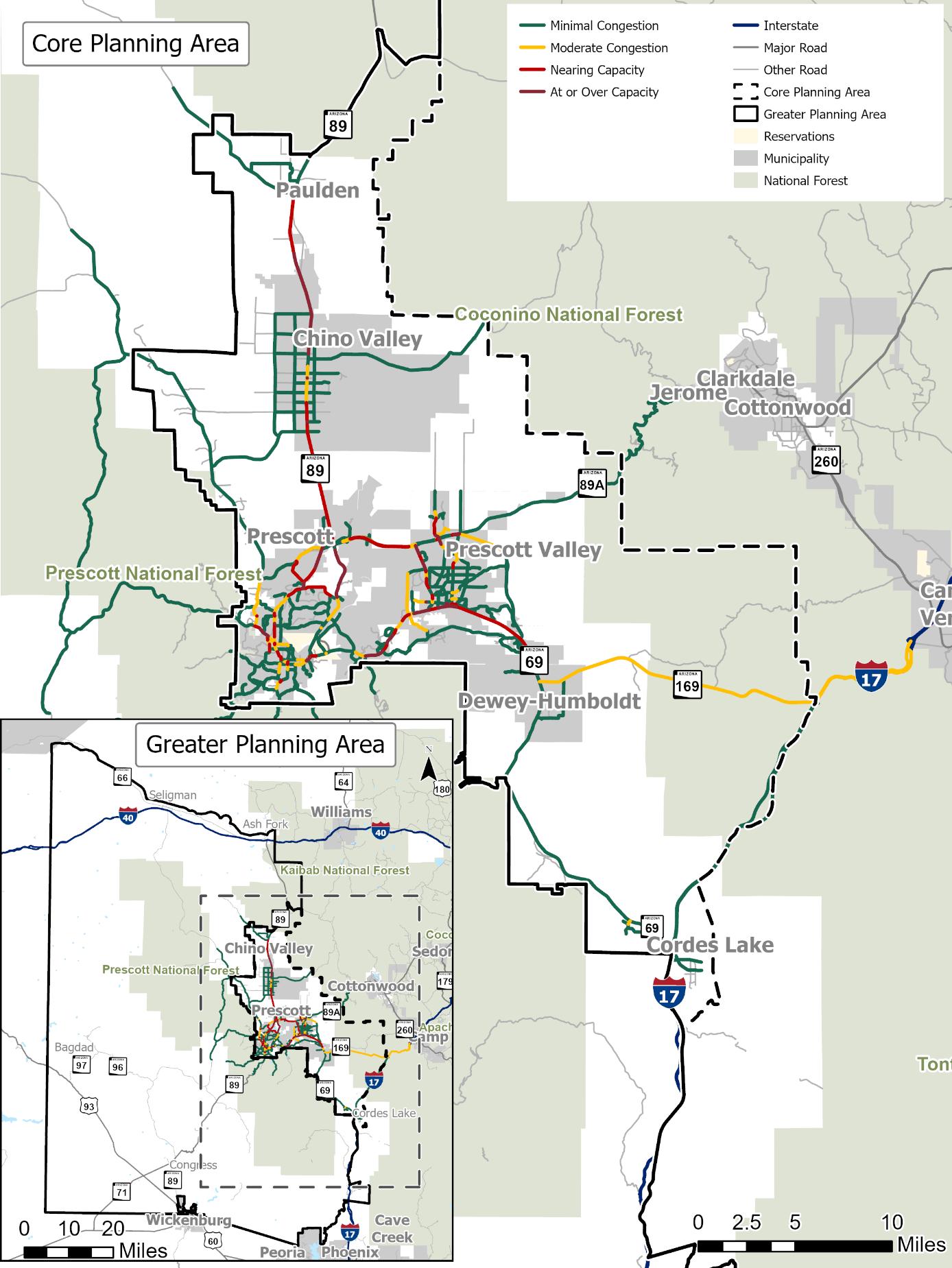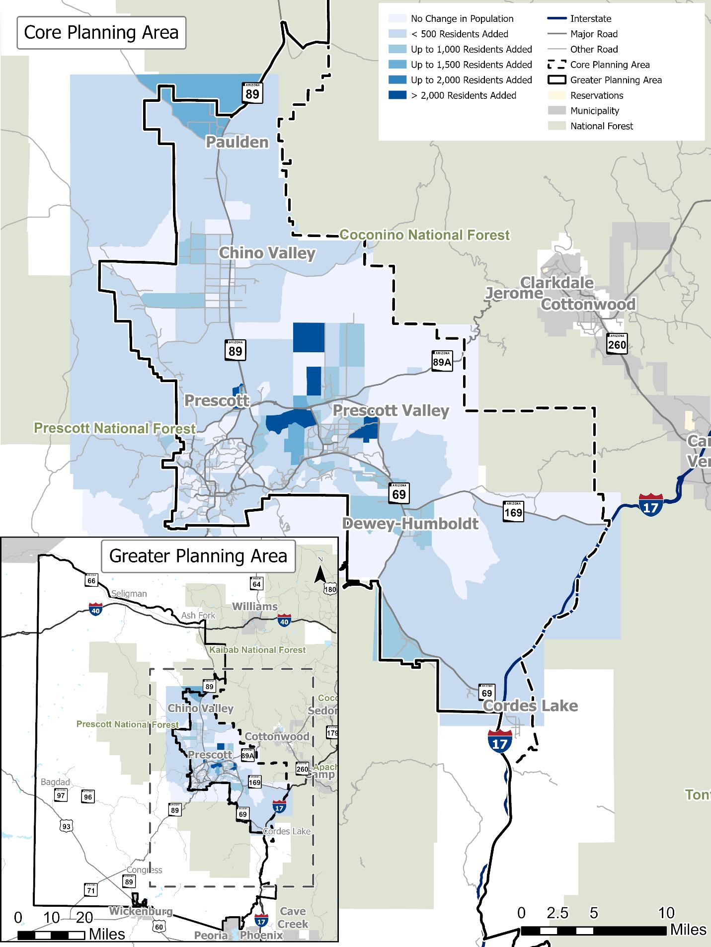 • Greater Planning Area. This area includes much of the newly added areas to the MPO boundary that encompass western and southern Yavapai County
