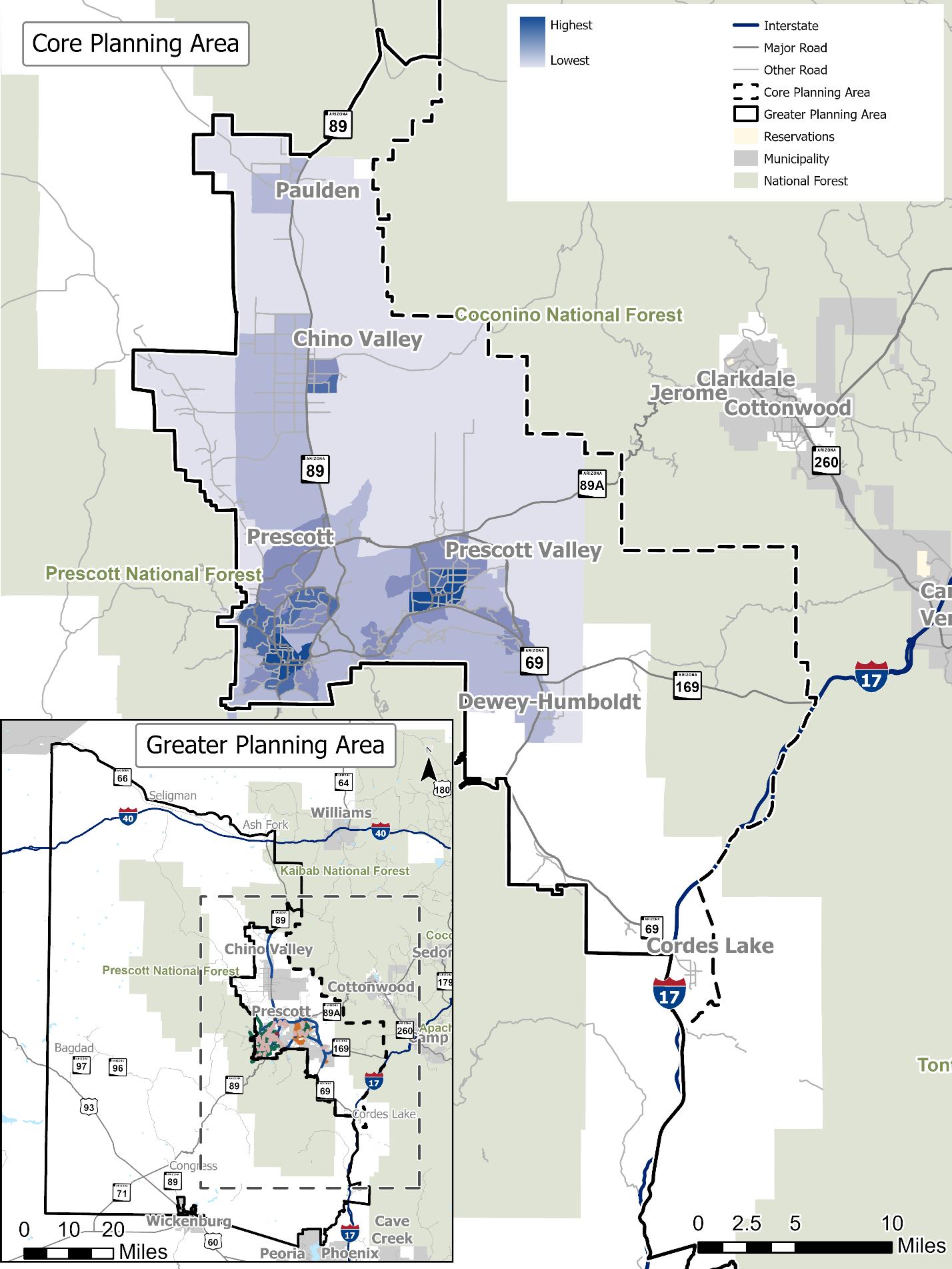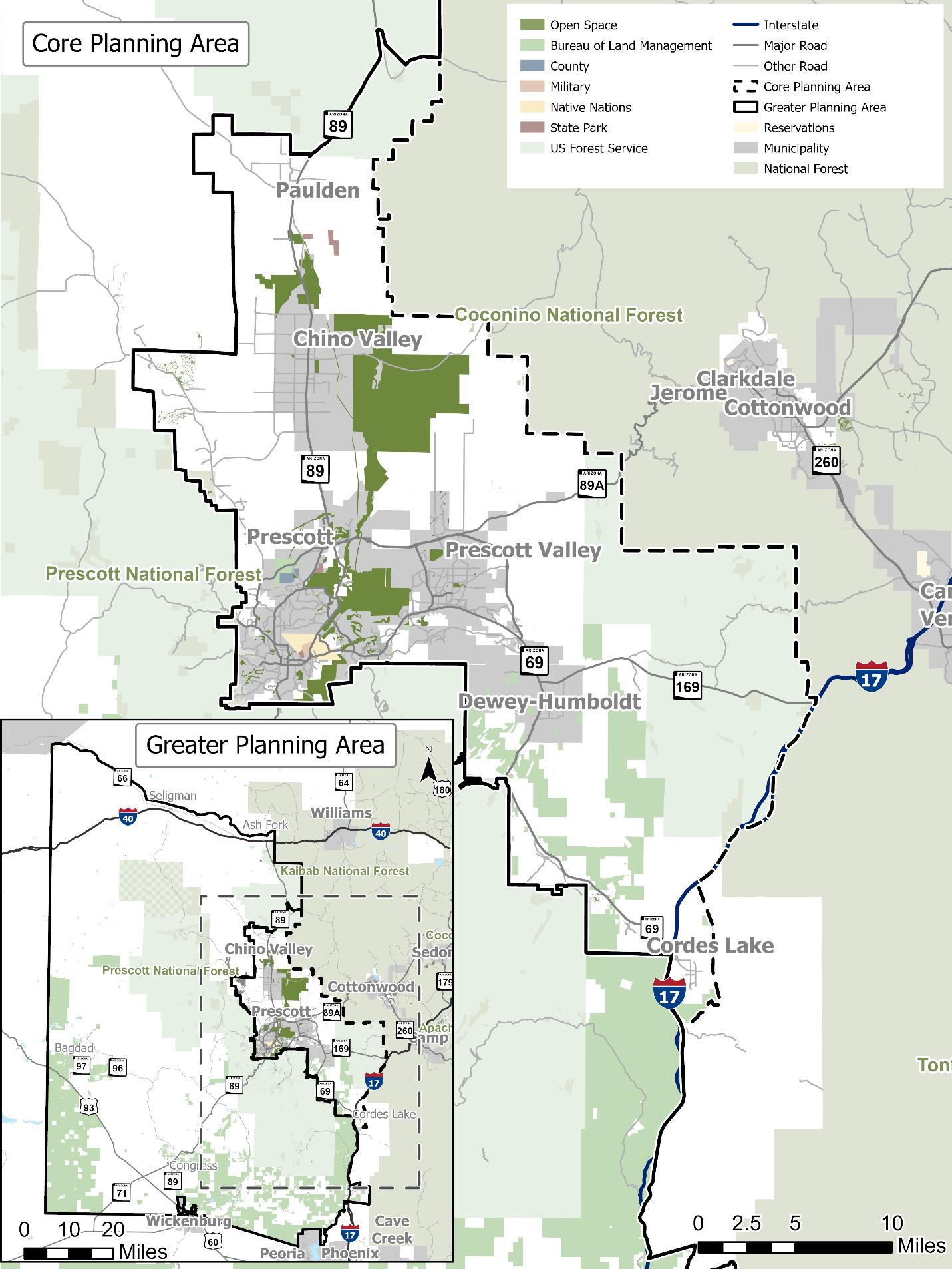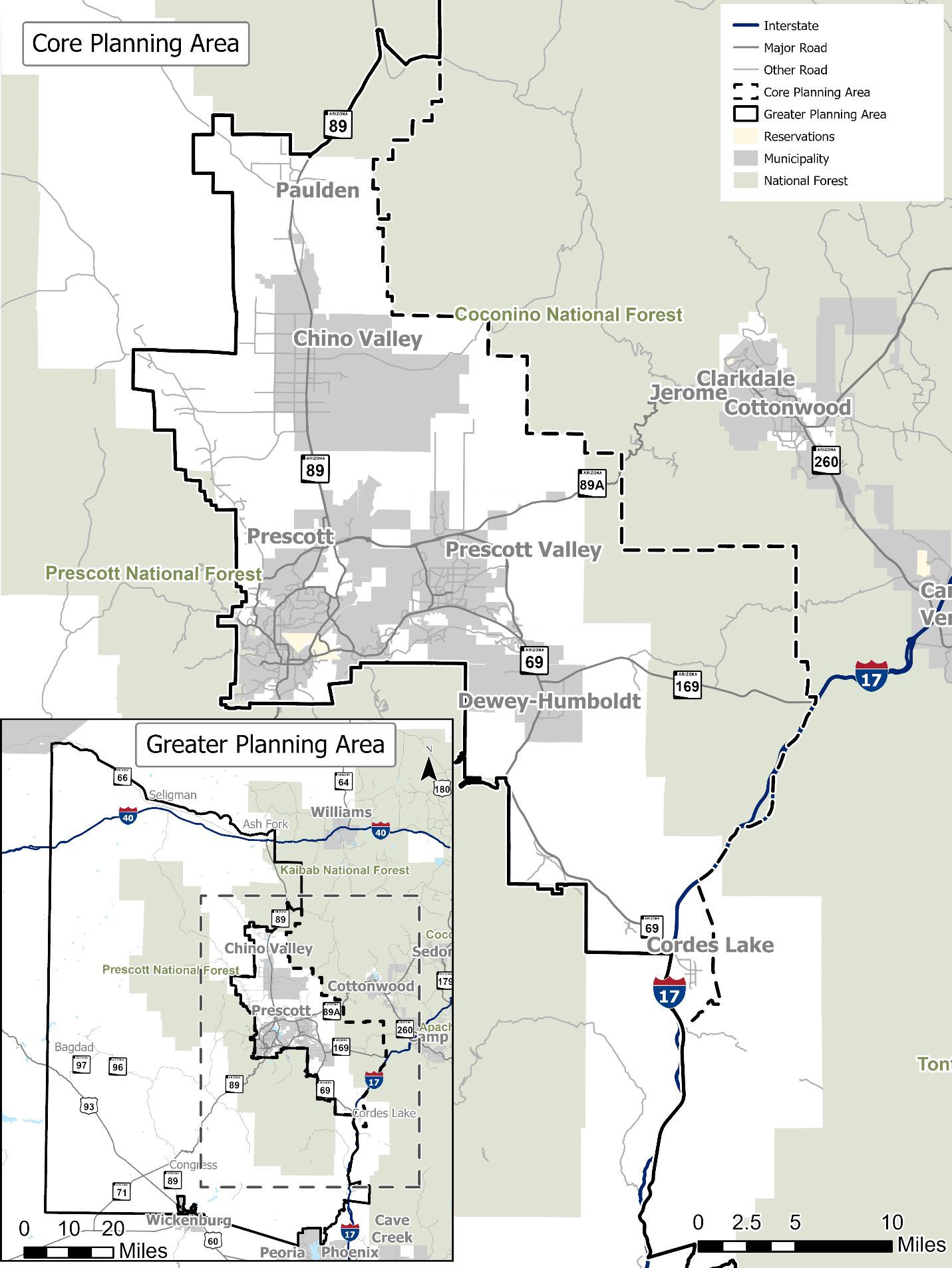 • Core Planning Area. This area includes the incorporated limits of Prescott, Prescott Valley, Chino Valley, and Dewey-Humboldt along with the more populated portions of Yavapai County adjacent to these municipalities.