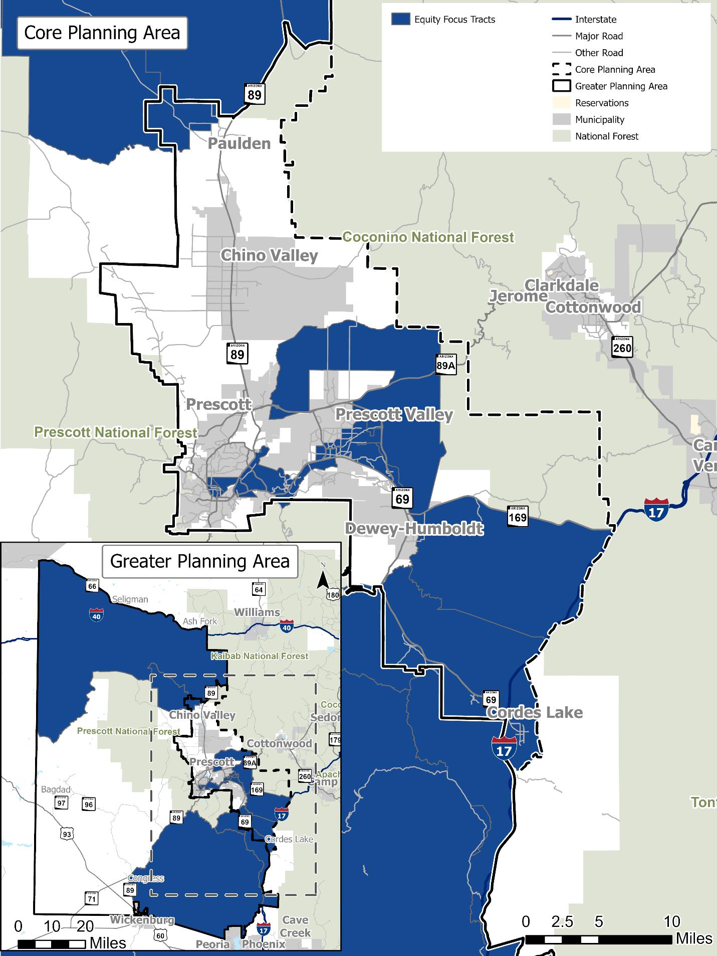 The focus areas for equitable investments were selected at locations that overlap and have intense need. Move 2050 equity focus areas are shown in Figure 6 Equity focus areas are commonly located in southern Prescott and Prescott Valley and near the Yavapai-Prescott Indian Tribe.