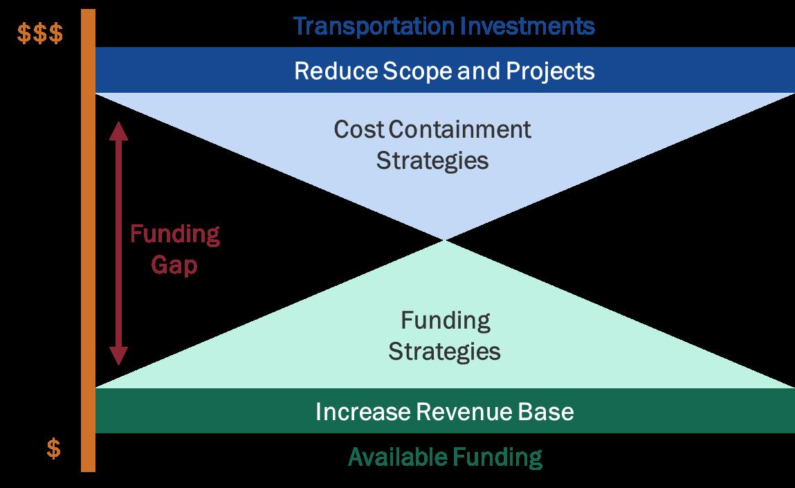 Due to limited funding available to CYMPO and its member agencies, there is a funding gap between the available funding for the region and the cost of the recommended transportation projects in Move 2050. A variety of strategies will be needed to leverage the limited regional funding to obtain additional funds through funding sources defined in the following subsections. If funding is not secured, the number of projects implemented, or the project scopes will need to be reduced. Figure 51 shows funding gap strategies for Move 2050.