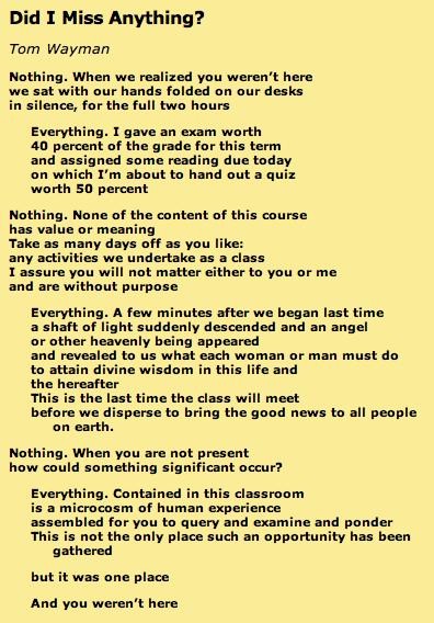 It is the policy of the University to excuse the absences of students that result from religious observances and to reschedule examinations and additional required classwork that may fall on religious holidays, without penalty. In keeping with stated university policy, an exception will be made for religious holidays. They will not count toward the absence limit if you notify me in advance in writing. (“It is the policy of the University to excuse absences of students that result from religious observances and to provide without penalty for the rescheduling of examinations and additional required classwork that may fall on religious holidays.” Section 3.13.2, OU Faculty Handbook)