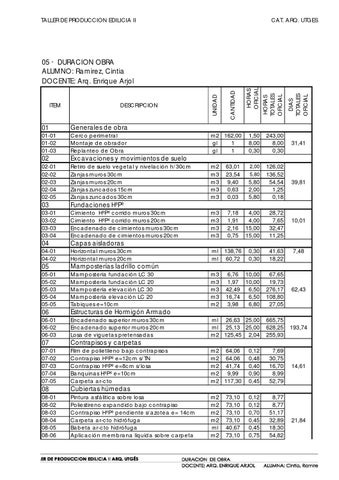 05 · DURACION OBRA ALUMNO: Ramirez, Cintia DOCENTE: Arq. Enrique Arjol