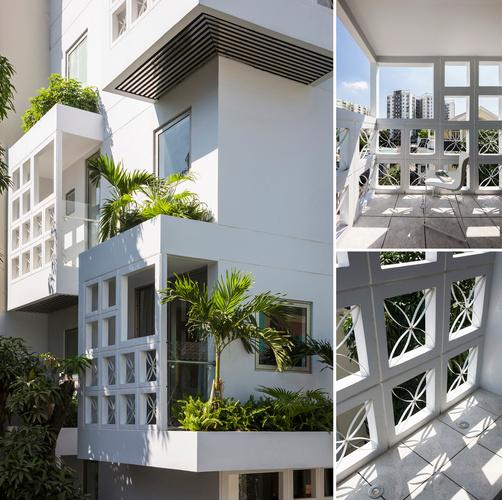 Balkon di design nuansa tropis dengan dinding balkon yang menggunakan bata berongga agar udara dapat mengalir memalui rongga tersebut dan tanaman hijau yang menjadi penghalang masuknya cahaya matahari secara langsung.