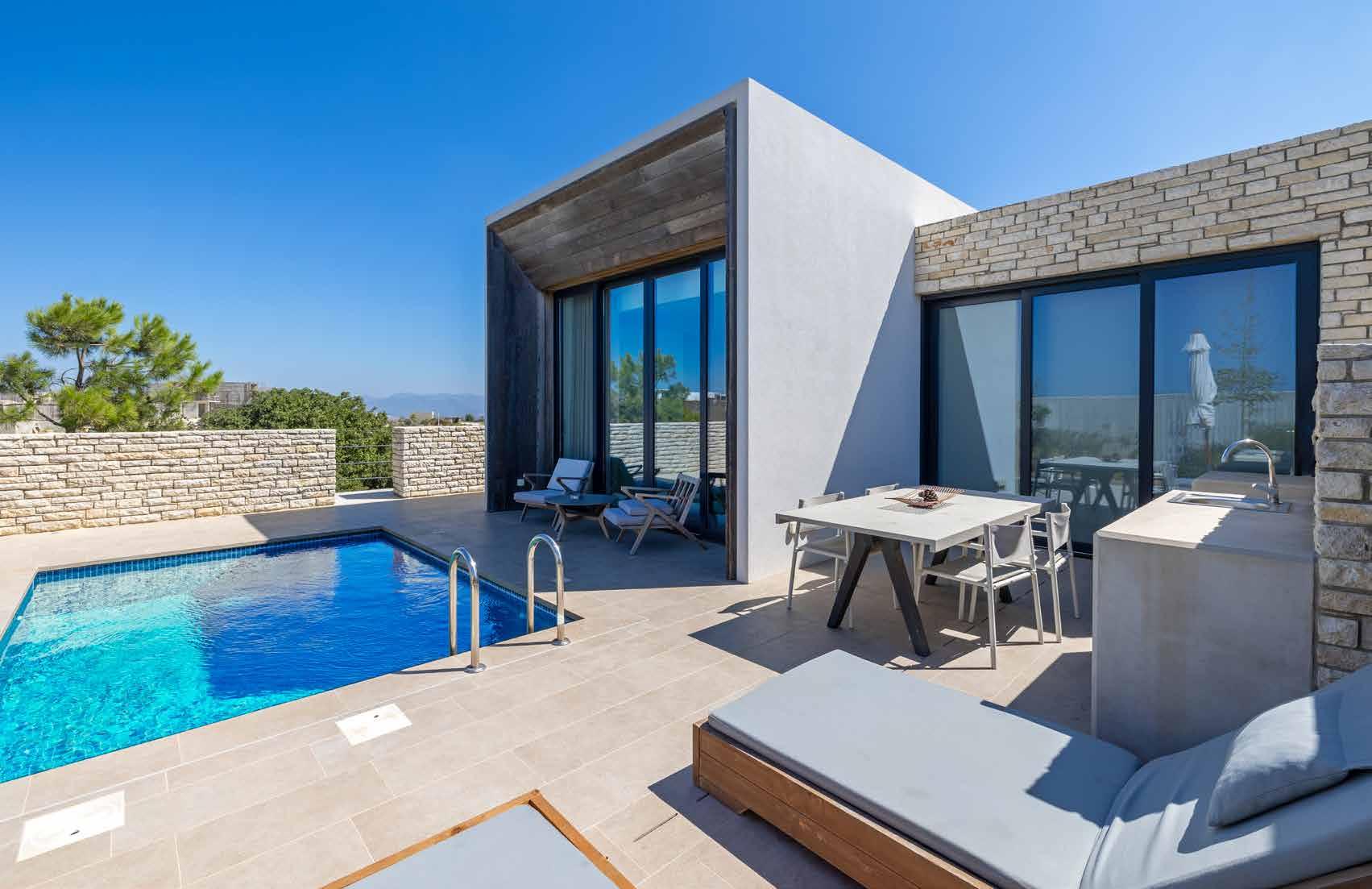 This lovely two-bedroom villa with breathtaking views of the mountains, greets you with a generously proportioned flowing open-plan layout living space featuring a dining area and two bedrooms, all filled with natural light through floor-toceiling windows.