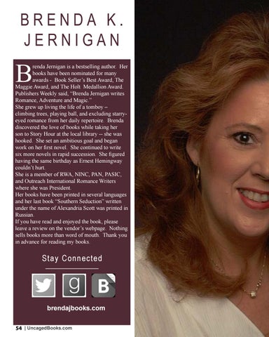 renda Jernigan is a bestselling author. Her books have been nominated for many awards - Book Seller’s Best Award, The Maggie Award, and The Holt Medallion Award. Publishers Weekly said, “Brenda Jernigan writes Romance, Adventure and Magic.” She grew up living the life of a tomboy – climbing trees, playing ball, and excluding starryeyed romance from her daily repertoire. Brenda discovered the love of books while taking her son to Story Hour at the local library -- she was hooked. She set an ambitious goal and began work on her first novel. She continued to write six more novels in rapid succession. She figured having the same birthday as Ernest Hemingway couldn’t hurt. She is a member of RWA, NINC, PAN, PASIC, and Outreach International Romance Writers where she was President. Her books have been printed in several languages and her last book “Southern Seduction” written under the name of Alexandria Scott was printed in Russian. If you have read and enjoyed the book, please leave a review on the vendor’s webpage. Nothing sells books more than word of mouth. Thank you in advance for reading my books.