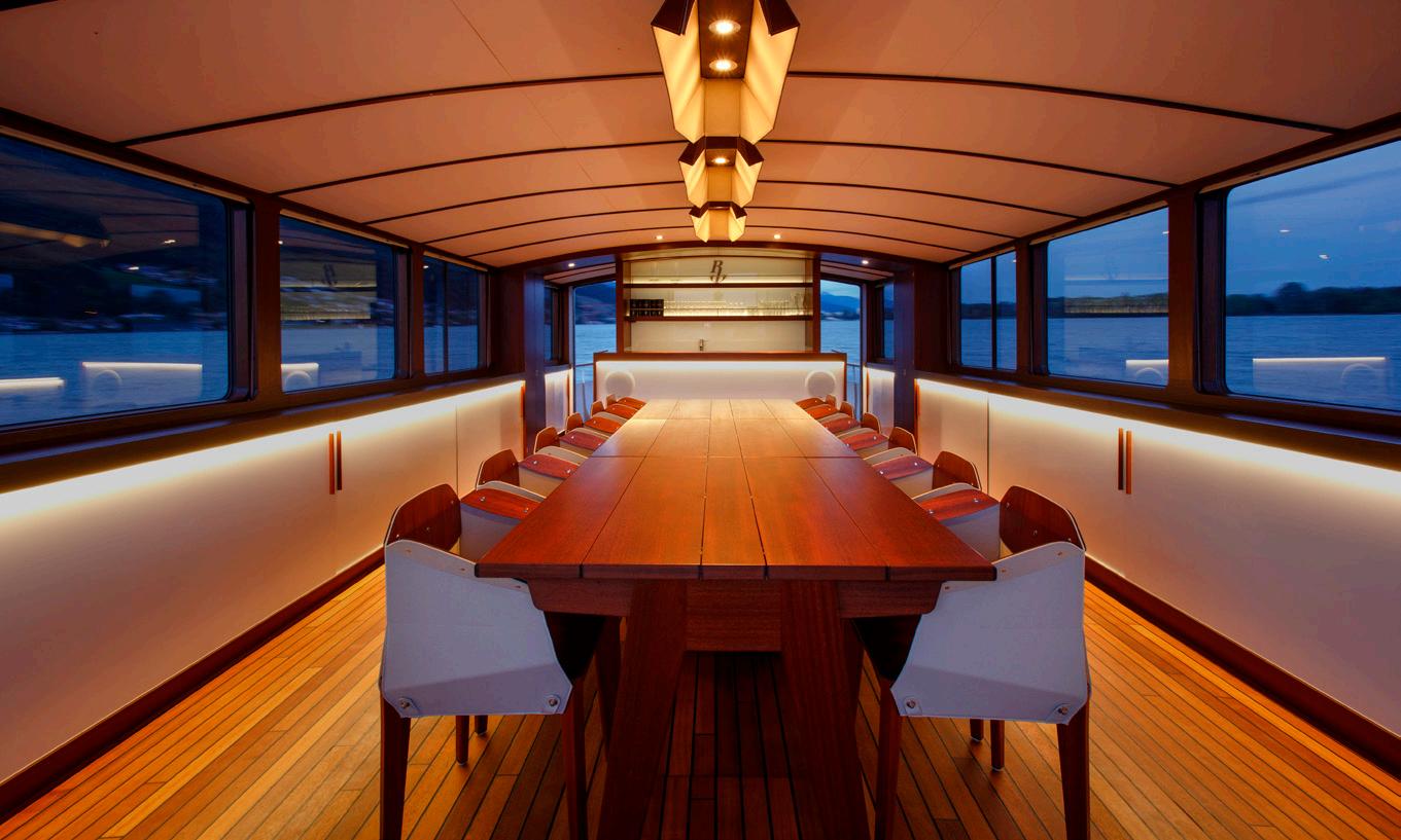 Das Schiff von 1952, heute vollständig elektrifiziert, verbindet technische Innovation mit poetischer Ruhe. Diese Dualität zeigt sich in allem: in der Gestaltung, der lautlosen Navigation und in der Küche, die die Präzision der Region kulinarisch interpretiert.