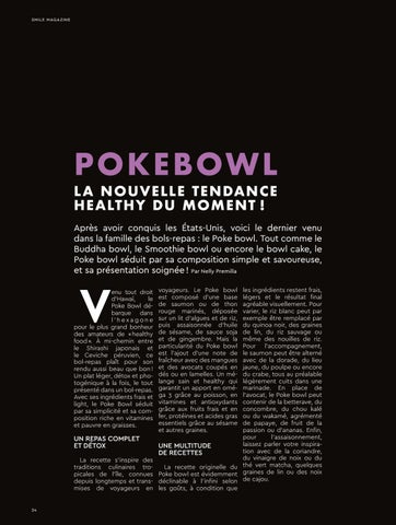 les ingrédients restent frais, légers et le résultat final agréable visuellement. Pour varier, le riz blanc peut par exemple être remplacé par du quinoa noir, des graines de lin, du riz sauvage ou même des nouilles de riz. Pour l’accompagnement, le saumon peut être alterné avec de la dorade, du lieu jaune, du poulpe ou encore du crabe, tous au préalable légèrement cuits dans une marinade. En place de l’avocat, le Poke bowl peut contenir de la betterave, du concombre, du chou kalé ou du wakamé, agrémenté de papaye, de fruit de la passion ou d’ananas. Enfin, pour l’assaisonnement, laissez parler votre inspiraUNE MULTITUDE tion avec de la coriandre, DE RECETTES du vinaigre de noix ou du La recette originelle du thé vert matcha, quelques Poke bowl est évidemment graines de lin ou des noix déclinable à l’infini selon de cajou. les goûts, à condition que