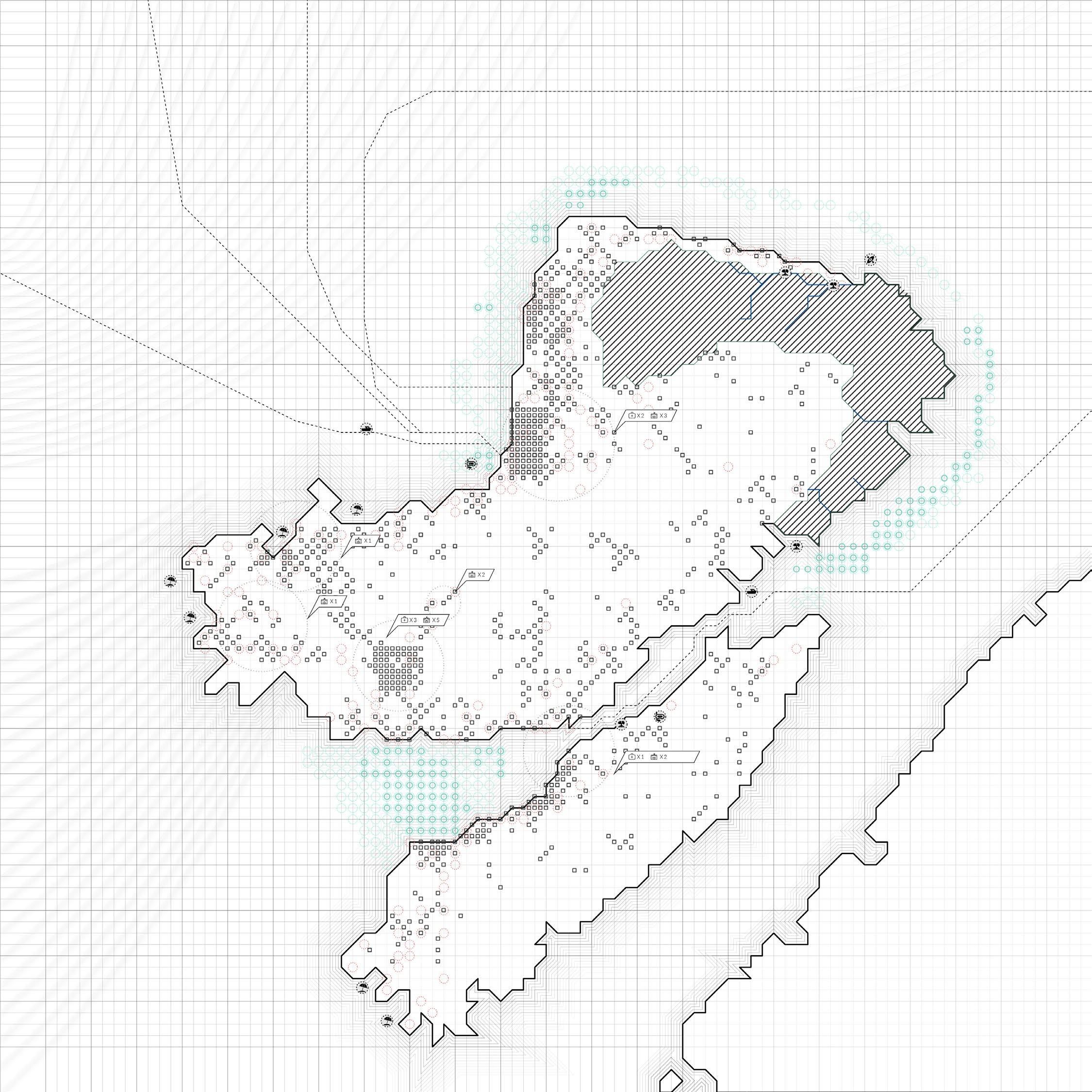 The project is composed of a series of floor slabs, minimizing vertical elements to create an open and fluid spatial arrangement above the water. By subtly manipulating the floor lines, the design introduces varied spatial conditions that accommodate different activities—open platforms for gatherings, stepped down for performance, and sheltered zones for farming-related tasks. These platforms are equipped with rotatable panels, water, and electrical outlets, allowing the space to adapt easily to the unpredictable farming schedule and evolving needs. The goal is to create a flexible structure that supports the seaweed farming community while responding to the pressures of tourism.