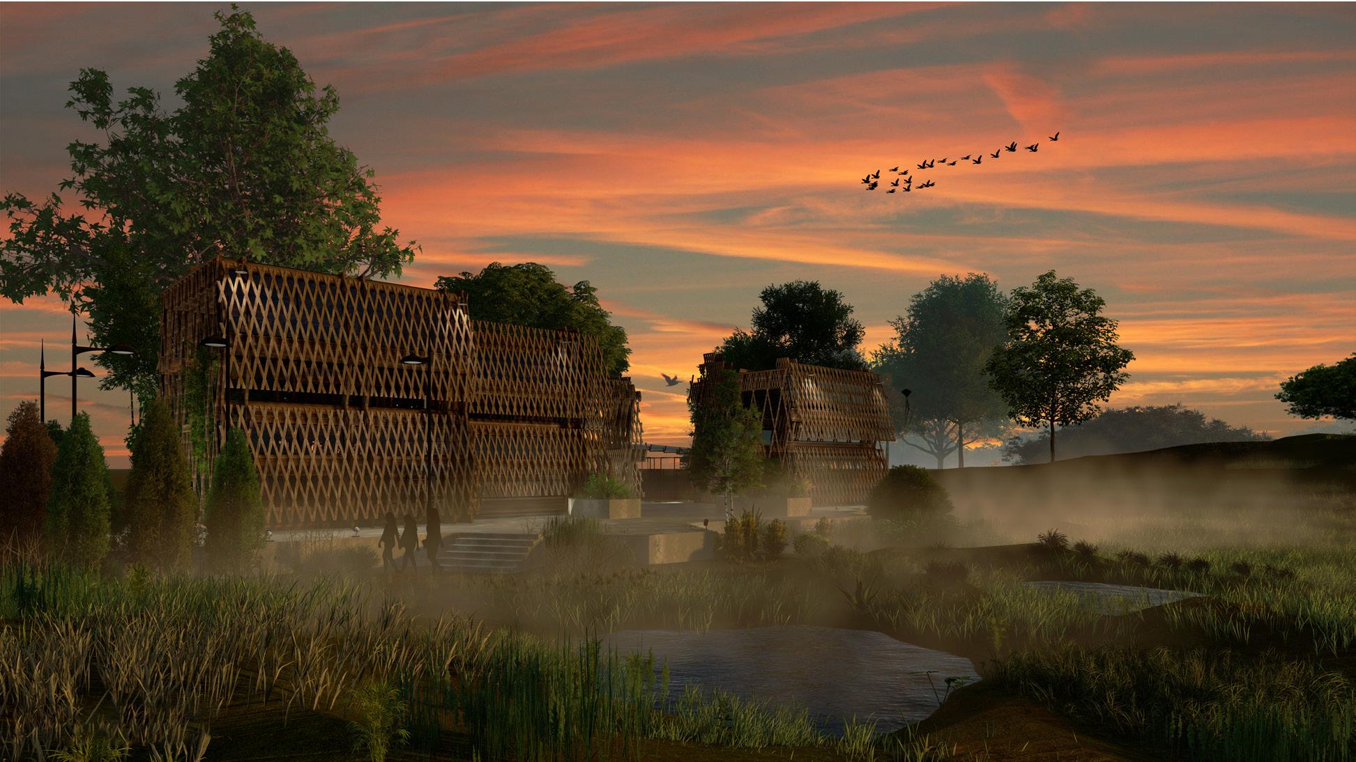 The visitors come from the roads in the north west direction. Welcomed by the bushes and ponds, they enter the first building of greenhouse in the ease side and left to reach out to the community gardens area in the deep east of the site. The ponds help store rainwater and serve for irrigation purpose.
