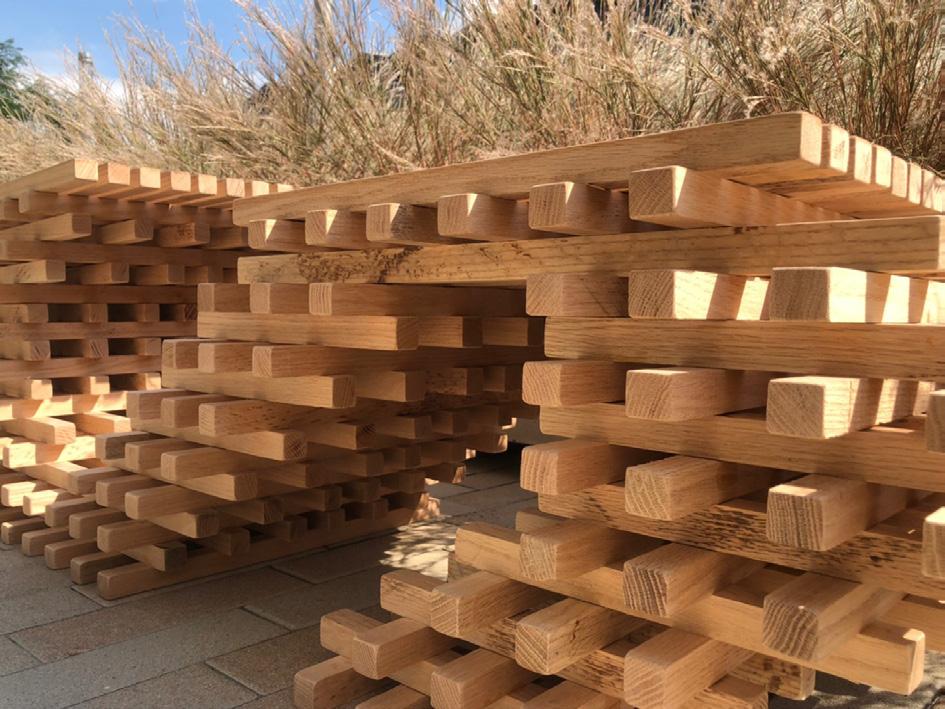 Bench Design and Production is a realization of a curvy shape by replicate cross wood stacking.