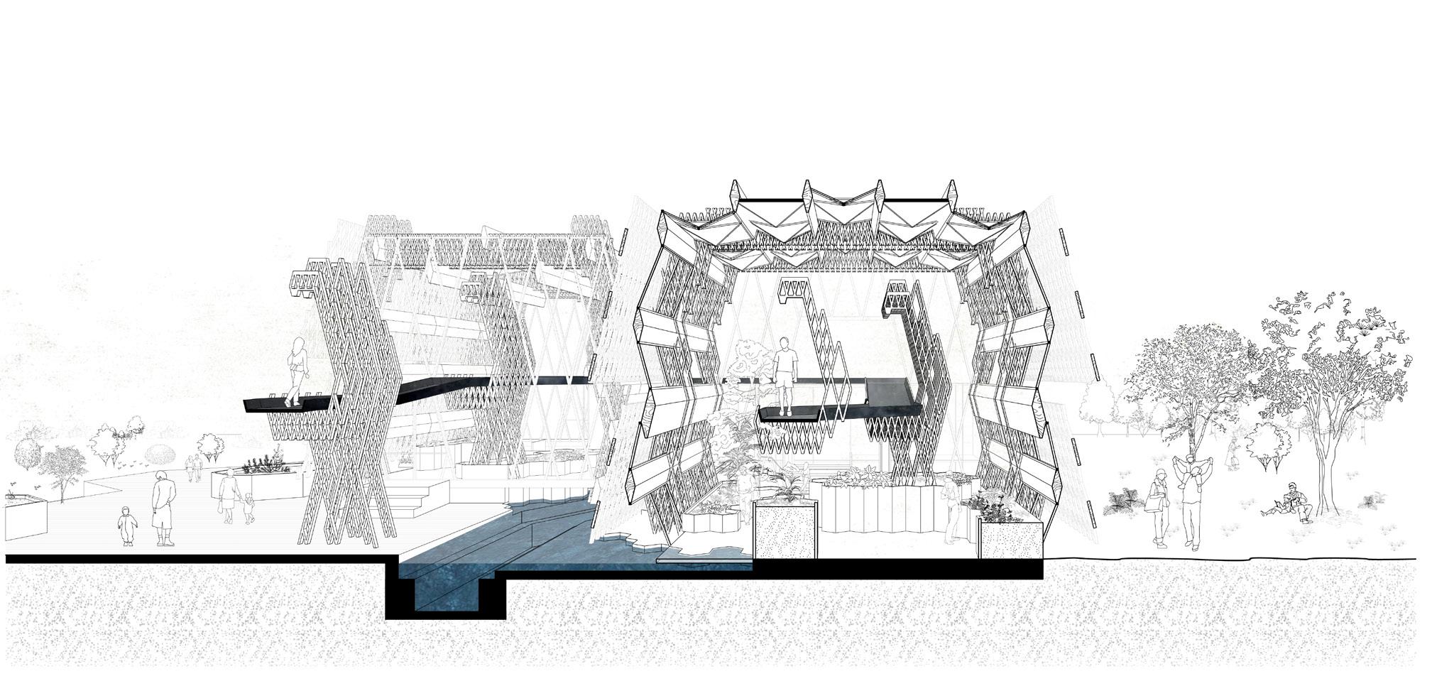 The three building groups are connected by elevated platforms. In addition, a circular traffic flow is created between the floors. Visitors can move on the platforms outside the buildings.