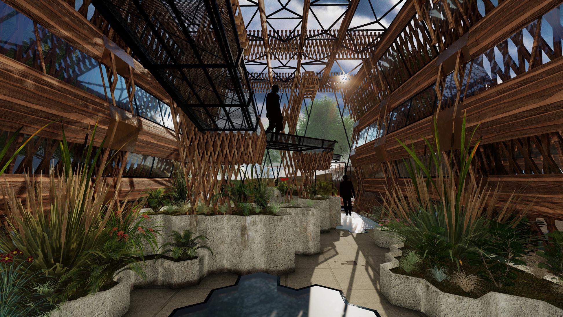 2. In addition, the structure lifts up the pathway to allow the visitor sense the on exhibit flora in an unconventional position. The pathway tours the visitors around the space and surroundings.
