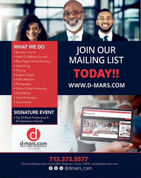MR. D-MARS Visit Us Online www.d-mars.com d-mars.com dmarsmarketing dmars_com dmars_com MAIN OFFICE 7322 Southwest Fwy, Suite 800, Houston, TX 77074 ADVERTISING | MARKETING MEDIA | COMMUNICATION Phone: (713) 373.5577 Fax: (713) 750.9472 Email Us: contact@d-mars.com CERTIFIED: HMSDC Port Houston METRO City of Houston HISD HUB VBE DBE HHF CB/LB Houston Minority Supplier Development Council • Business Journal •