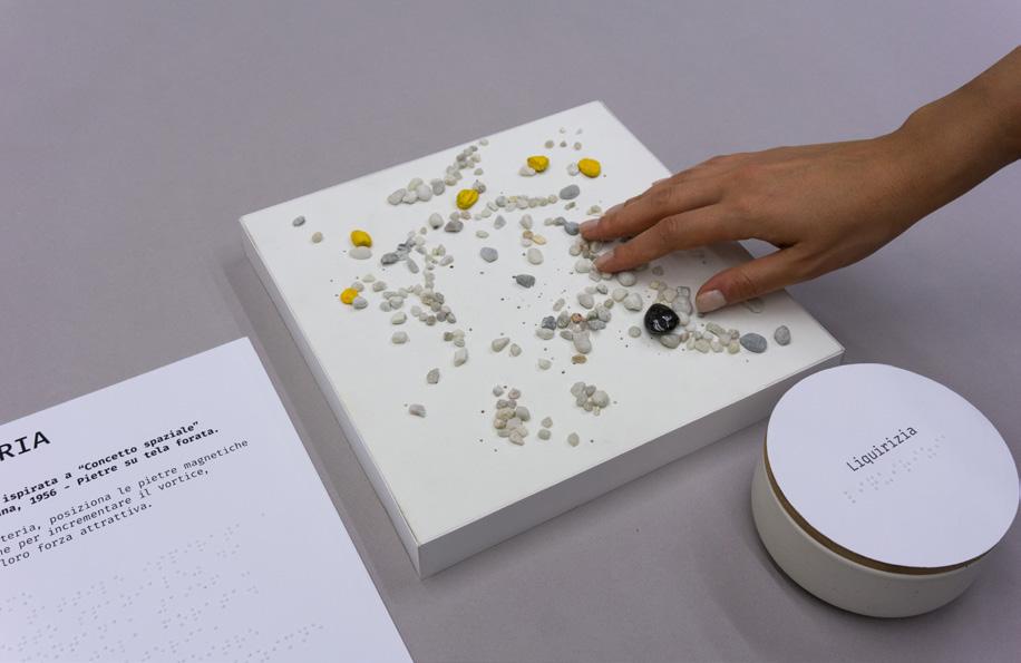Bianco vivo is a museum pathway that narrates the potential of white through a triptych of artworks, linked by the theme of color and exhibited at the Museo del Novecento in Milan. The project's objective was to create a system of artifacts that could communicate in an accessible manner, making the three artworks enjoyable for blind or visually impaired users. For this reason, the system includes elements that refer to different senses in a complementary way. The main artifact is a short animated video designed to be experienced by deaf and blind individuals. The system also comprises three interactive tactile panels that evoke the distinctive elements of each artwork, as well as various Braille captions. Additionally, there are three boxes containing candies whose taste and shape are matched to the referenced work.