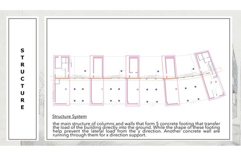 Structure System the main structure of columns and walls that form 5 concrete footing that transfer the load of the building directly into the ground. While the shape of these footing help prevent the lateral load from the y direction. Another concrete wall are running through them for x direction support.