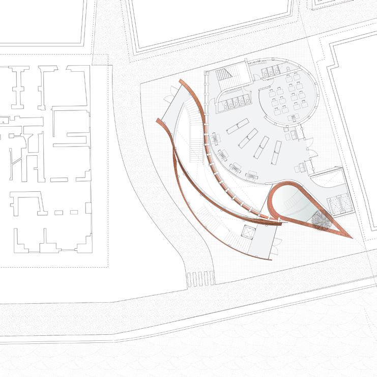The final facade system stems from the orbtal rings of the Aristotelian Planetarium on display at the museum. The decision to make it copper and parts of the rest of the exterior highlight this idea of weaving, juxtaposing Florence’s history of red brick.